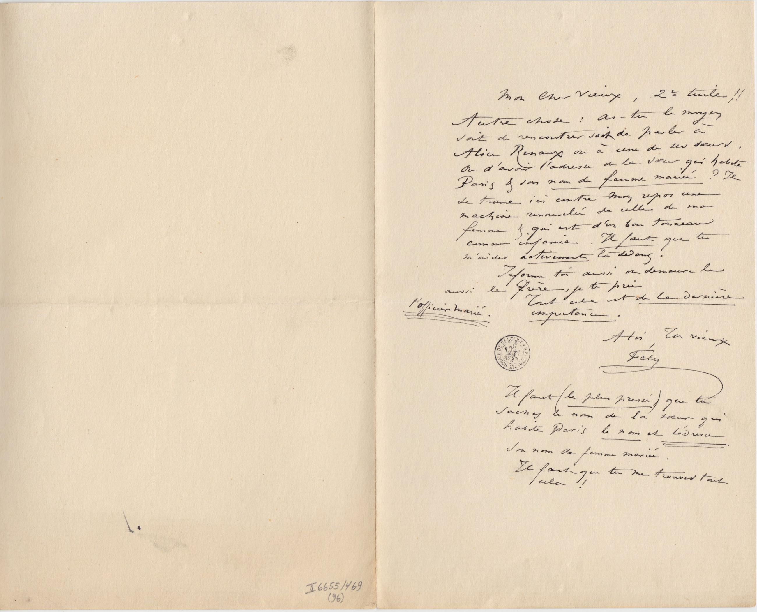 Autre chose : As-tu le moyen soit de rencontrer soit de parler à Alice Renaux ou à une de ses sœurs. Ou d’avoir l’adresse de la sœur qui habite Paris & son nom de femme mariée ? Il se trame ici contre mon repos une machine renouvelée de celle de ma femme & qui est d’un bon tonneau comme infamie. Il faut que tu m’aides activement là dedans.