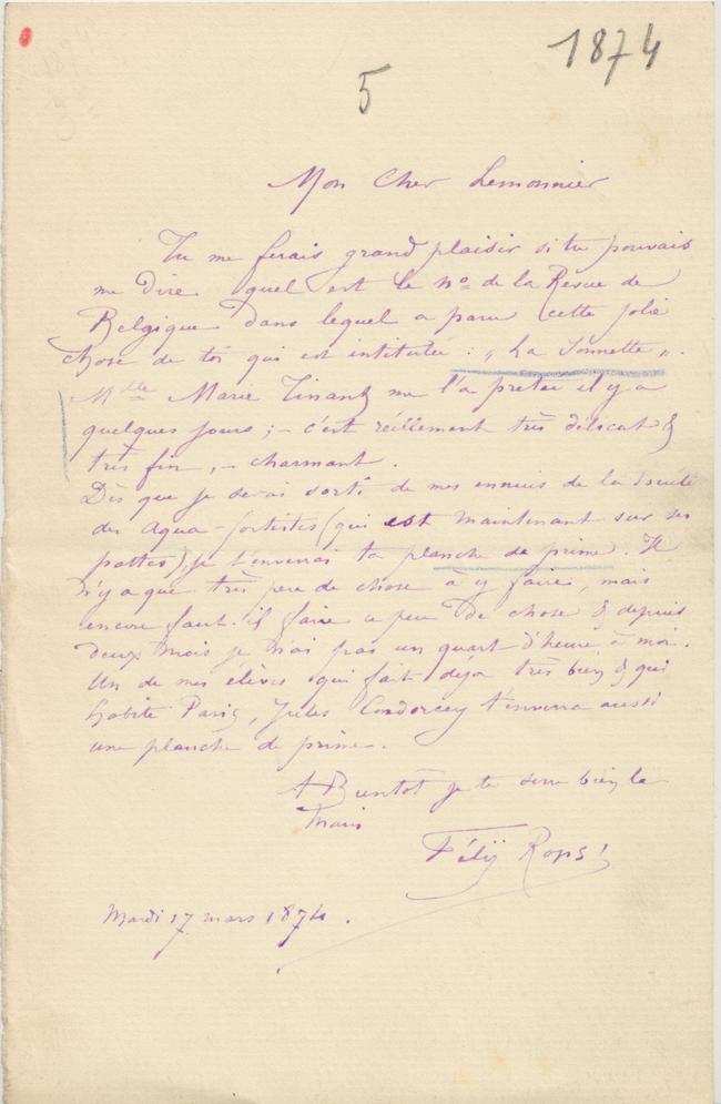 Tu me ferais grand plaisir si tu pouvais me dire quel est le n° de la Revue de Belgique dans lequel a paru cette jolie chose de toi qui est intitulée : « La Sonnette ». Mlle Marie Tinant me l’a prêtée il y a quelques jours ; – c’est réellement très délicat & très fin, – charmant.