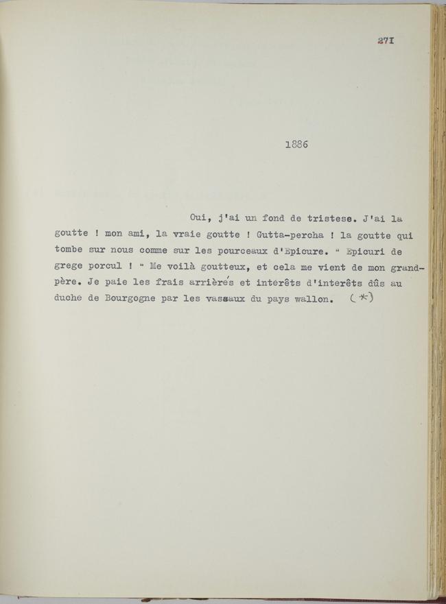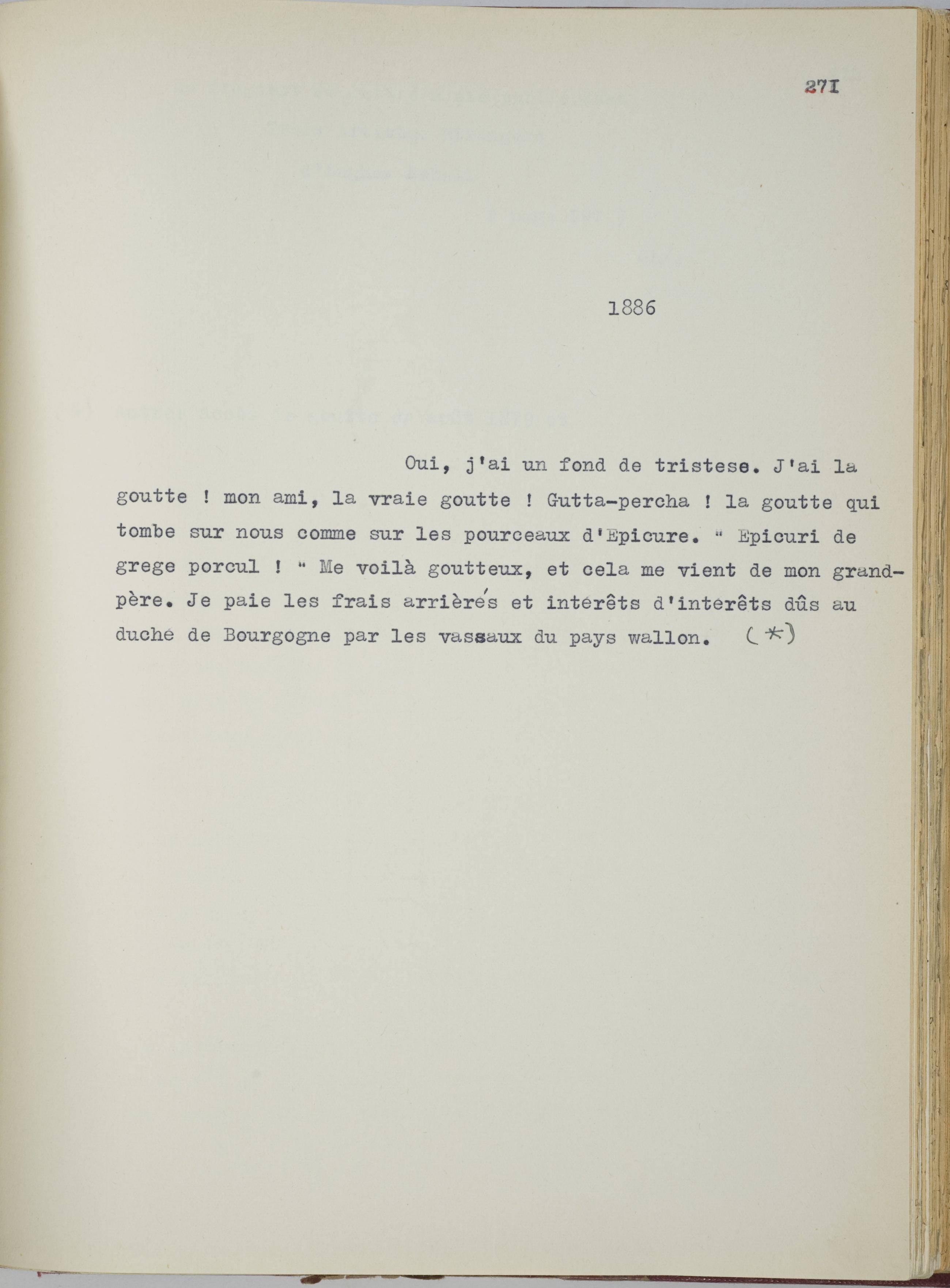 Oui, j’ai un fond de tristesse. J’ai la goutte ! mon ami, la vraie goutte ! Gutta-percha ! la goutte qui tombe sur nous comme sur les pourceaux d’Epicure. « Epicuri de grege porcum ! » Me voilà goutteux, et cela me vient de mon grand-père. Je paie les frais arriérés et intérêts d’intérêts dus au duché de Bourgogne par les vassaux du pays wallon.