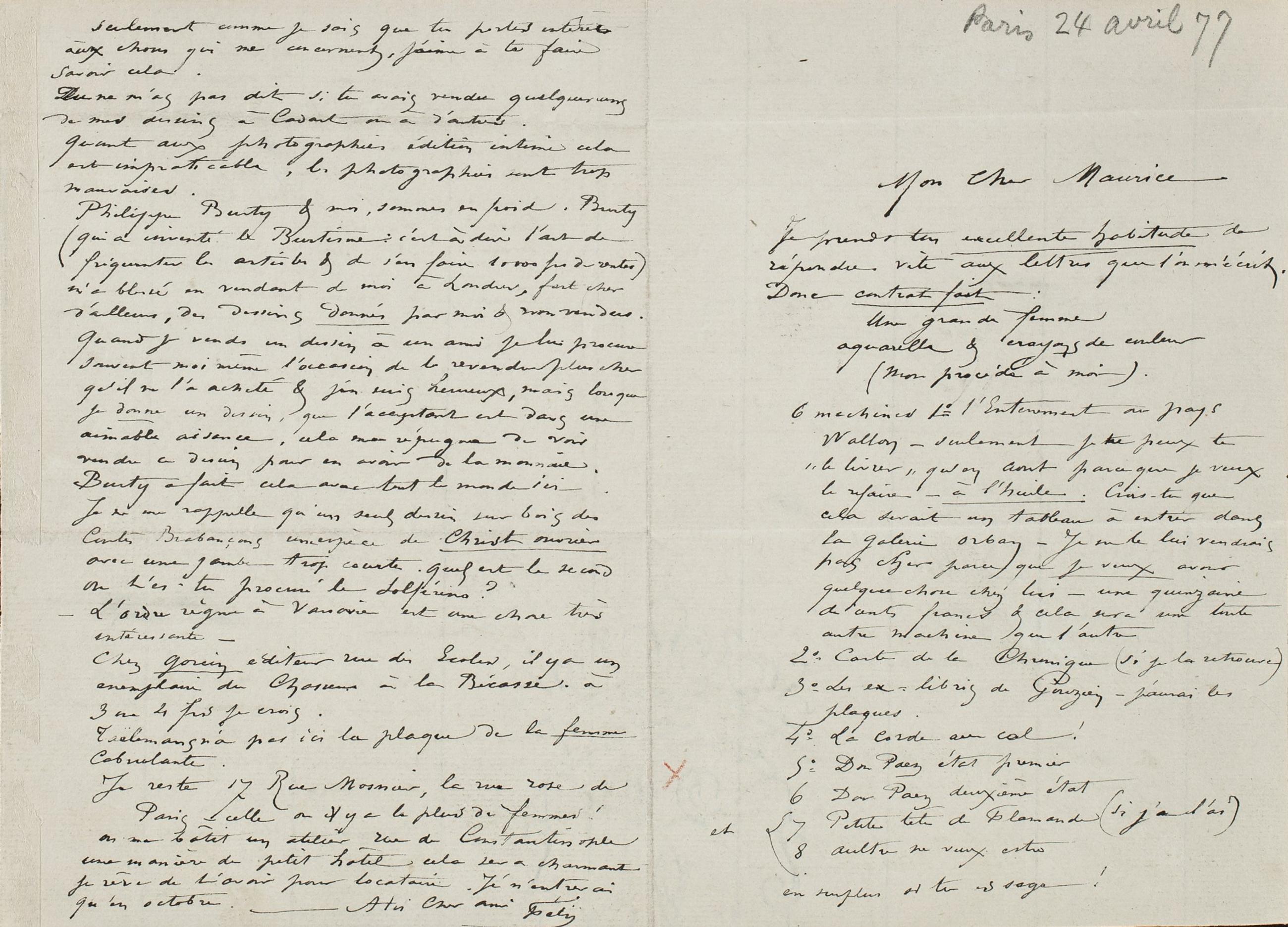 Philippe Burty & moi, sommes en froid. Burty (qui a inventé le Burtisme : c’est à dire l’art de fréquenter les artistes & de s’en faire 10 000 frs de rentes) m’a blessé en vendant de moi à Londres, fort cher d’ailleurs, des dessins donnés par moi & non vendus. Quand je vends un dessin à un ami je lui procure souvent moi même l’occasion de le revendre plus cher qu’il ne l’a acheté & j’en suis heureux, mais lorsque je donne un dessin, que l’acceptant est dans une aimable aisance, cela me répugne de voir vendre ce dessin pour en avoir de la monnaie. Burty a fait cela avec tout le monde ici –. Je ne me rappelle qu’un seul dessin sur bois des Contes Brabançons une espèce de Christ ouvrier avec une jambe trop courte. Quel est le second Où t’es-tu procuré le solferino ?