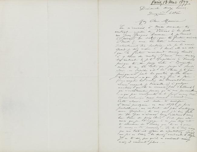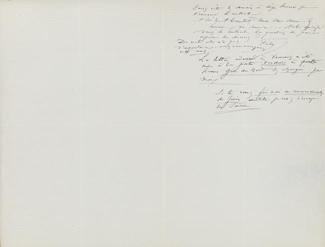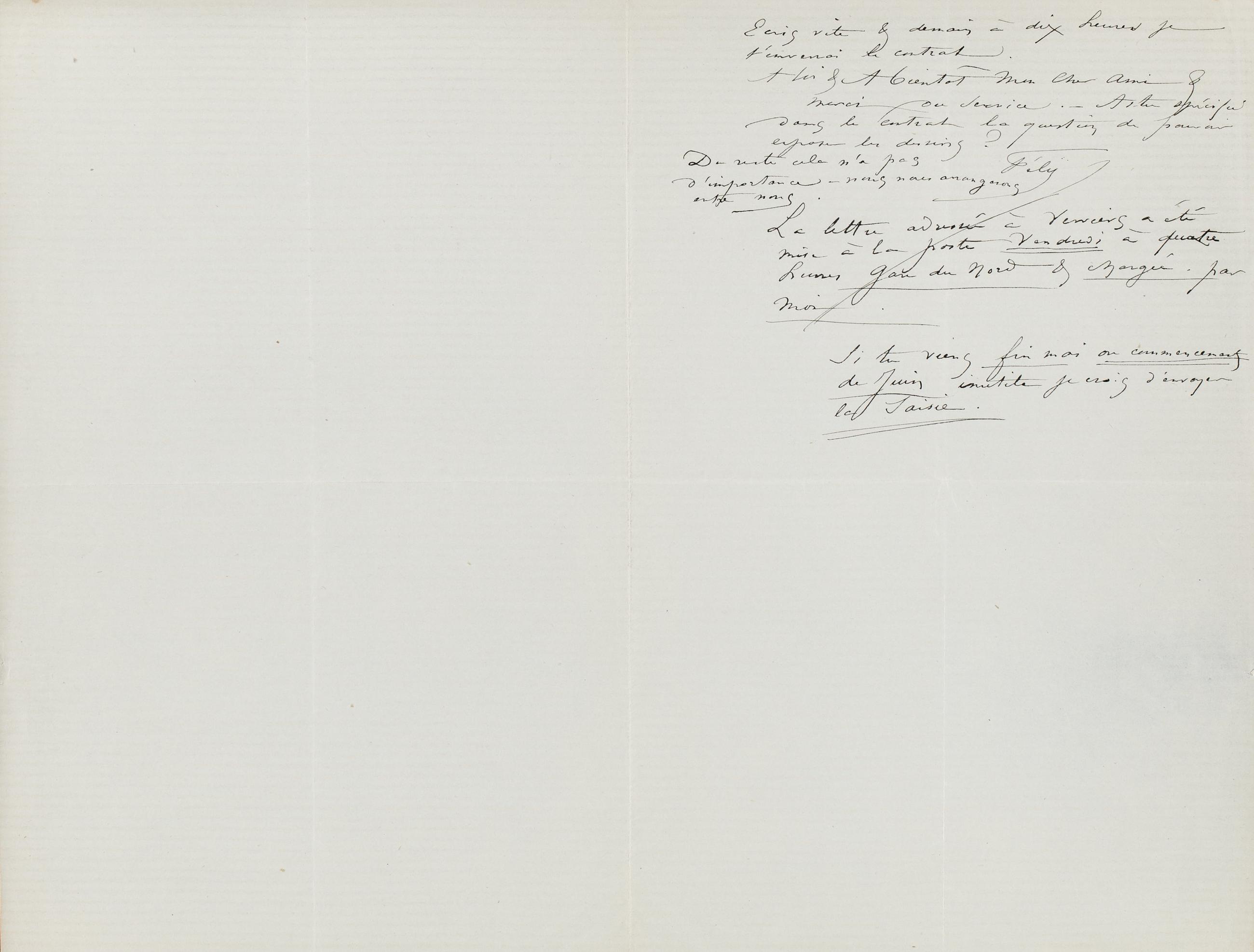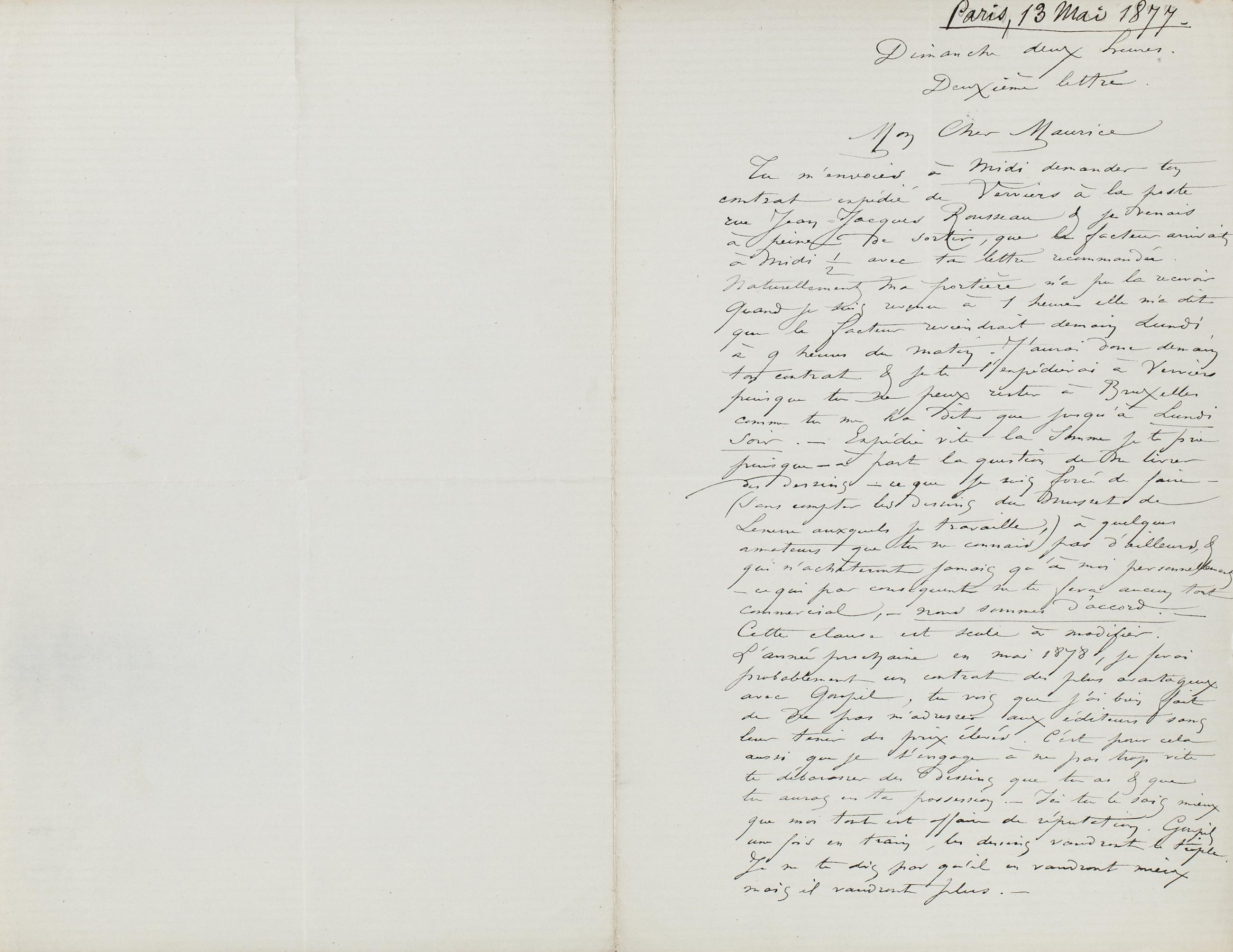 Naturellement ma portière n’a pu la recevoir. Quand je suis revenu à 1 heure elle m’a dit que le facteur reviendrait demain Lundi à 9 heures du matin. J’aurai donc demain ton contrat & je te l’expédierai à Verviers puisque tu ne peux rester à Bruxelles comme tu me l’a dit que jusqu’à Lundi soir. – Expédie vite la somme je te prie puisque – à part la question de me livrer des dessins – ce que je suis forcé de faire – (sans compter les dessins du Musset de Lemerre auxquels je travaille,) à quelques amateurs que tu ne connais pas d’ailleurs, & qui n’achèteront jamais qu’à moi personnellement – ce qui par conséquent ne te fera aucun tort commercial, – nous sommes d’accord. –