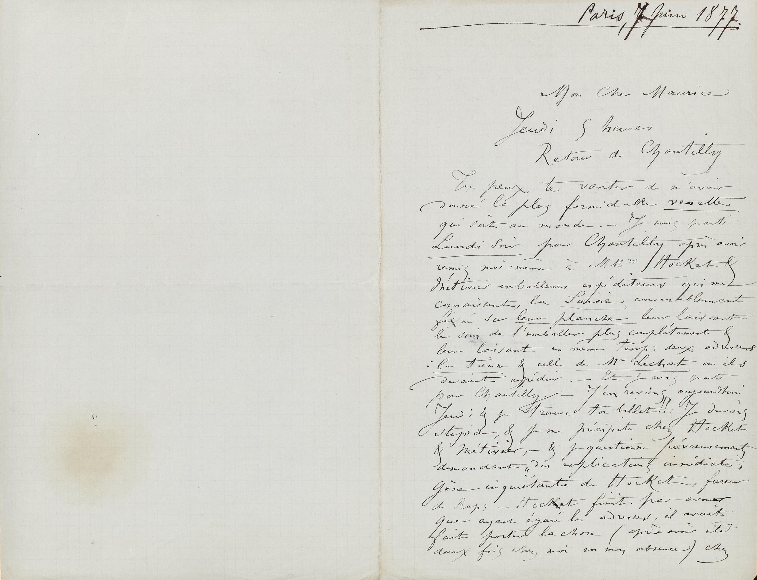 Tu peux te vanter de m’avoir donné la plus formidable venette qui soit au monde. – Je suis parti Lundi soir pour Chantilly après avoir remis moi-même à MMr Hocket & Métivier emballeurs expéditeurs qui me connaissent, la Saisie convenablement fixée sur leur planche leur laissant le soin de l’emballer plus complétement & leur laissant en même temps deux adresses : la tienne & celle de MrLechat où ils devaient expédier. – Et je suis parti pour Chantilly. – J’en reviens aujourdhui Jeudi & je trouve ton billet !! : Je deviens stupide, & je me précipite chez Hocket & Métivier, – & je questionne fiévreusement demandant « des explications immédiates » Gène inquiétante de Hocket, fureur de Rops – Hocket finit par avouer que ayant égaré les adresses, il avait fait porter la chose (après avoir été deux fois chez moi en mon absence) chez