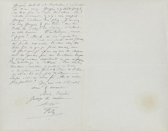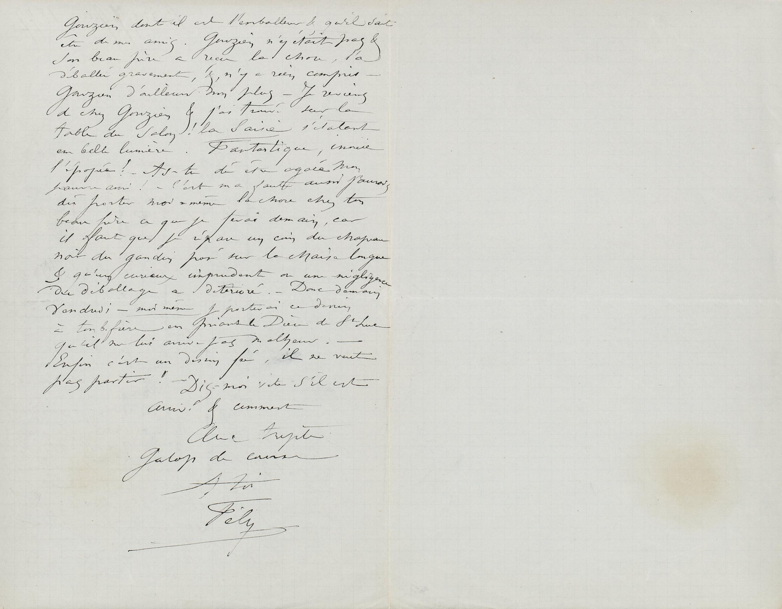 Gouzien dont il est l’emballeur & qu’il sait être de mes amis. Gouzien n’y était pas & son beau père a reçu la chose, l’a déballée gravement, &, n’y a rien compris – Gouzien d’ailleurs non plus – Je reviens de chez Gouzien & j’ai trouvé sur la table du salon ! la Saisie s’étalant en belle lumière. Fantastique, inouïe l’épopée ! – As-tu dû être agacé mon pauvre ami ! – C’est ma faute aussi j’aurais dû porter moi-même la chose chez ton beau frère ce que je ferai demain, car il faut que je répare un coin du chapeau noir du gandin posé sur la chaise longue & qu’un curieux imprudent ou une négligence du déballage a déterioré. – Donc demain Vendredi – moi même je porterai ce dessin à ton b. frère en priant le Dieu de St Luc qu’il ne lui arrive pas malheur. –