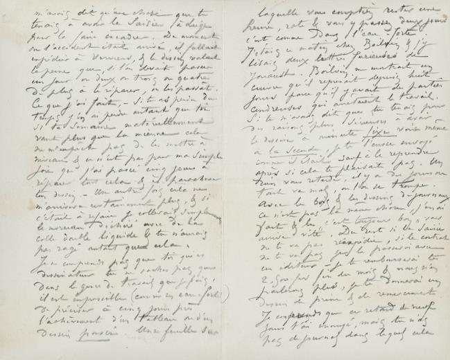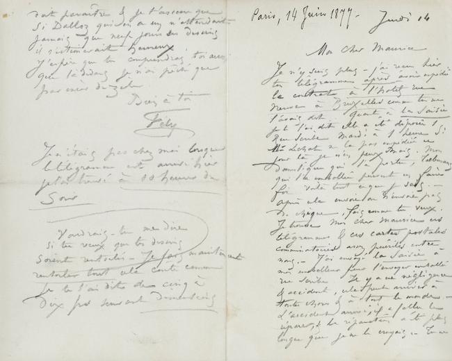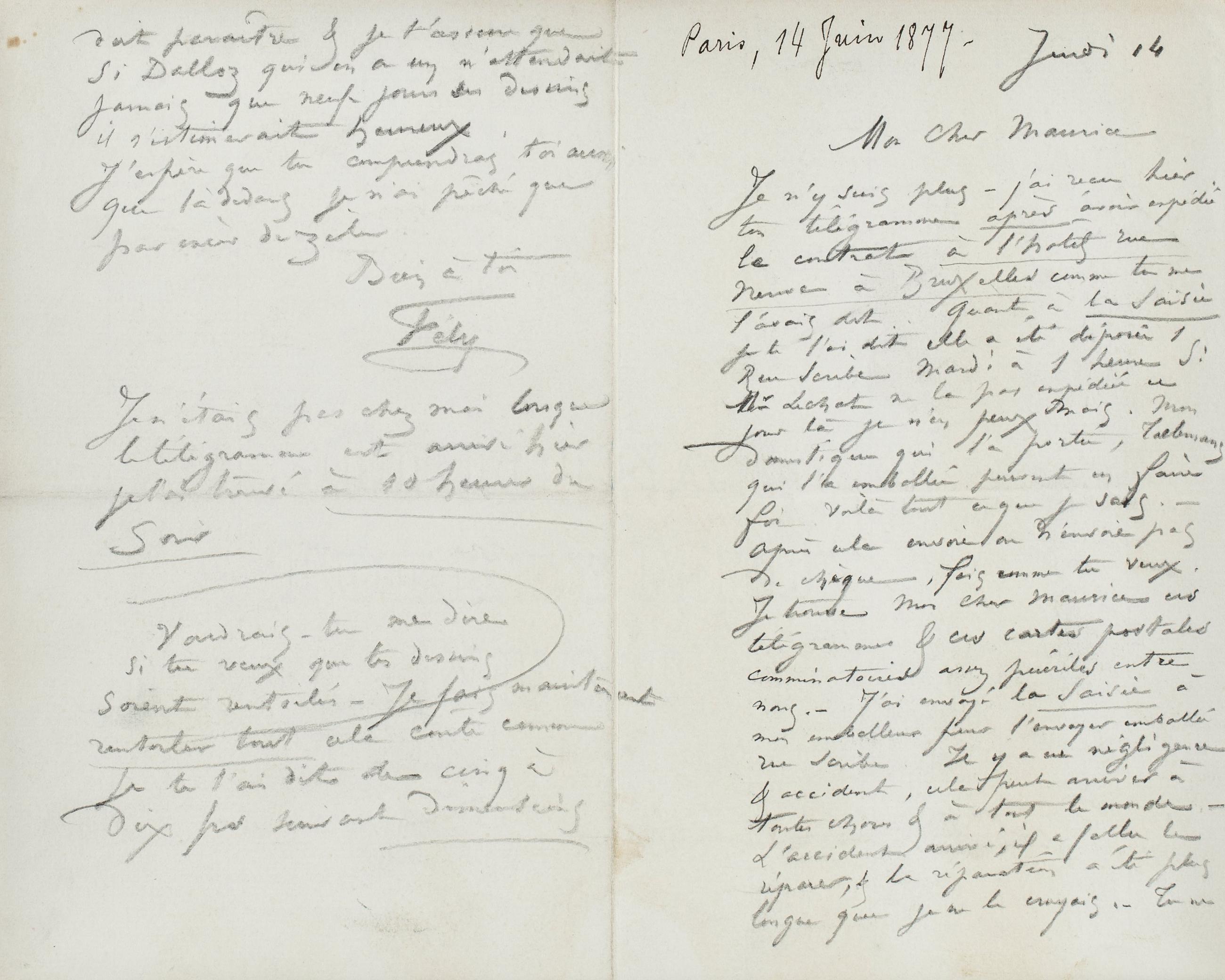 Je n’y suis plus – j’ai reçu hier ton télégramme après avoir expédié le contrat à l’hôtel rue Neuve à Bruxelles comme tu me l’avais dit. Quant à la Saisie je te l’ai dit elle a été déposée 1 Rue Scribe Mardi à 1 heure Si Mr Lechat ne la pas expédiée ce jour là je n’en peux mais. mon domestique qui l’a portée, Taelemans qui l’a emballée peuvent en faire foi. Voilà tout ce que je sais. – Après cela envoie ou n’envoie pas de chèque, fais comme tu veux. Je trouve mon cher Maurice ces télégrammes & ces cartes postales comminatoires assez puériles entre nous. – J’ai envoyé la Saisie à mon emballeur pour l’envoyer emballée rue Scribe. Il y a eu négligence & accident, cela peut arriver à toutes choses & à tout le monde – L’accident arrivé, il a fallu le réparer, & la réparation a été plus longue que je ne le croyais. – Tu ne