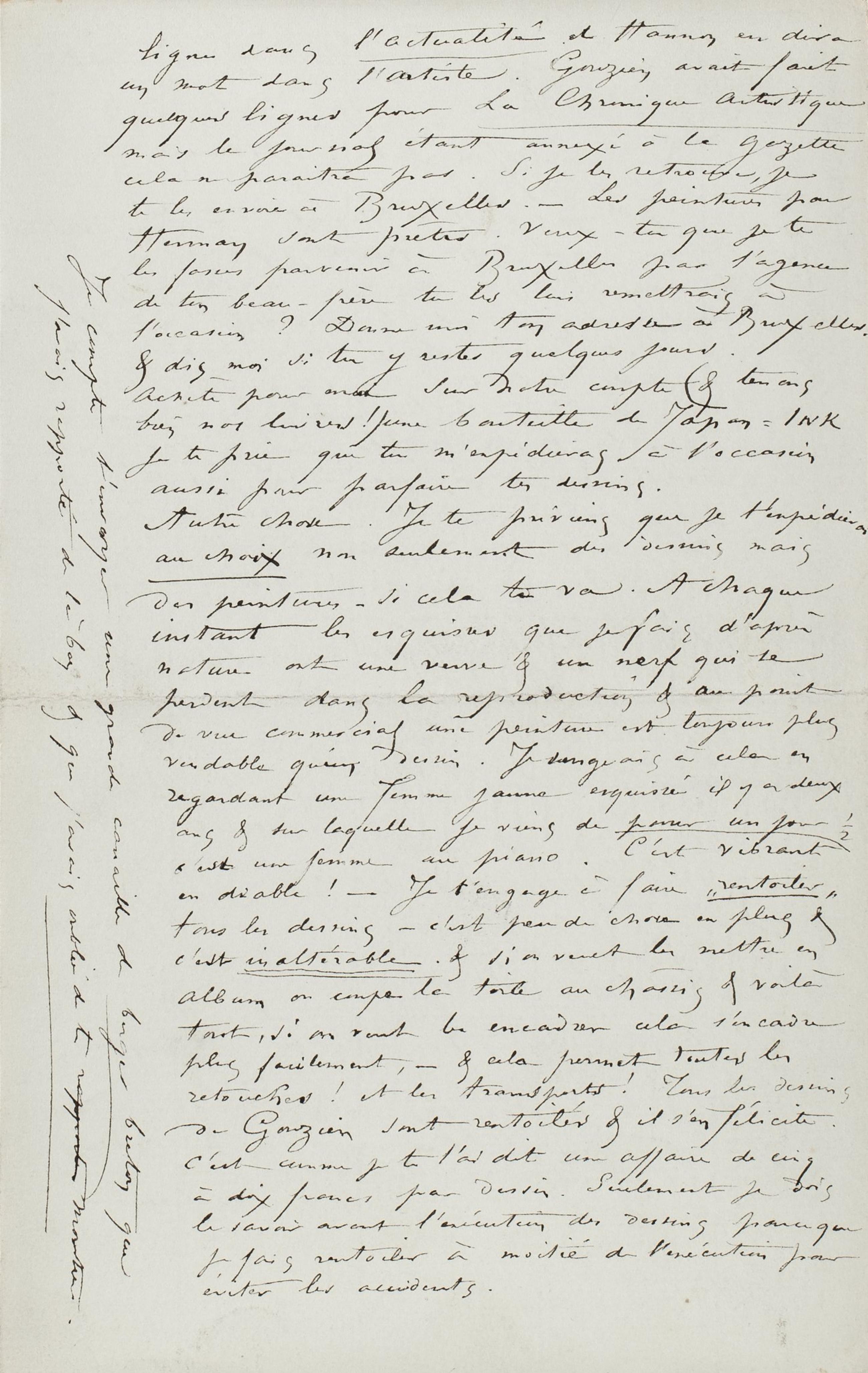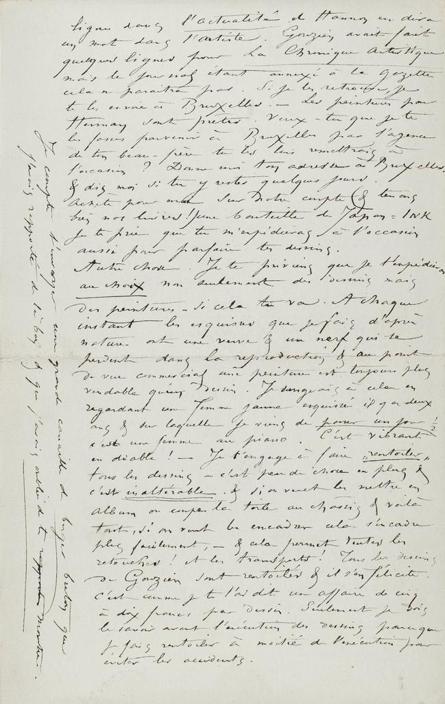 Autre chose. Je te préviens que je t’expédierai au choix non seulement des dessins mais des peintures – si cela te va. À chaque instant les esquisses que je fais d’après nature ont une verve & un nerf qui se perdent dans la reproduction & au point de vue commercial une peinture est toujours plus vendable qu’un dessin. Je songeais à cela en regardant une femme jaune esquissée il y a deux ans & sur laquelle je viens de passer un jour ½ c’est une femme au piano. C’est vibrant en diable ! – Je t’engage à faire « rentoiler » tous les dessins – c’est peu de chose en plus & c’est inaltérable. & si on veut les mettre en Album on coupe la toile au châssis & voilà tout, si on veut les encadrer cela s’encadre plus facilement, – & cela permet toutes les retouches ! et les transports ! Tous les dessins de Gouzien sont rentoilés & il s’en félicite. C’est comme je te l’ai dit une affaire de cinq à dix francs par dessin. Seulement je dois le savoir avant l’exécution des dessins parce que je fais rentoiler à moitié de l’exécution pour éviter les accidents.