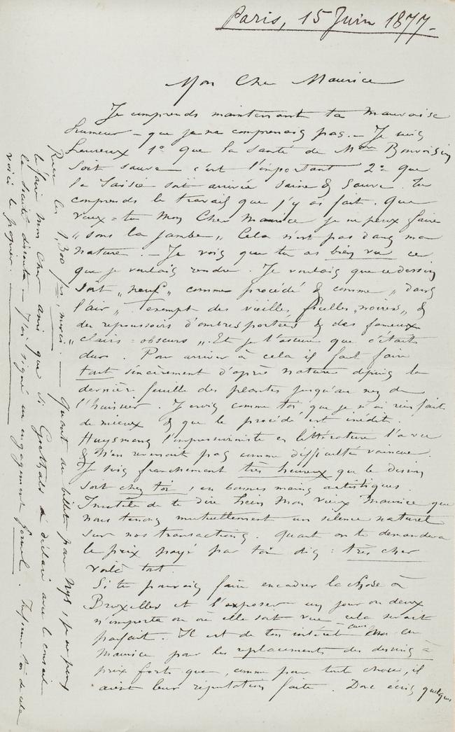 Je comprends maintenant ta mauvaise humeur – que je ne comprenais pas. – Je suis heureux 1° Que la santé de Mme Bonvoisin soit sauve c’est l’important 2° Que la Saisie soit arrivée saine & sauve. Tu comprends le travail que j’y ai fait. Que veux-tu Mon Cher Maurice je ne peux faire « sous la jambe » Cela n’est pas dans ma nature. – Je vois que tu as bien vu ce que je voulais rendre. Je voulais que ce dessin soit « neuf » comme procédé & comme « dans l’air ». exempt des vieilles ficelles « noires » & des repoussoirs d’ombres portées & des fameux « clairs-obscurs ». Et je t’assure que c’était dur. Pour arriver à cela il faut faire tout sincèrement d’après nature depuis la dernière feuille des plantes jusqu’au nez de l’huissier. Je crois comme toi, que je n’ai rien fait de mieux & que le procédé est inédit.