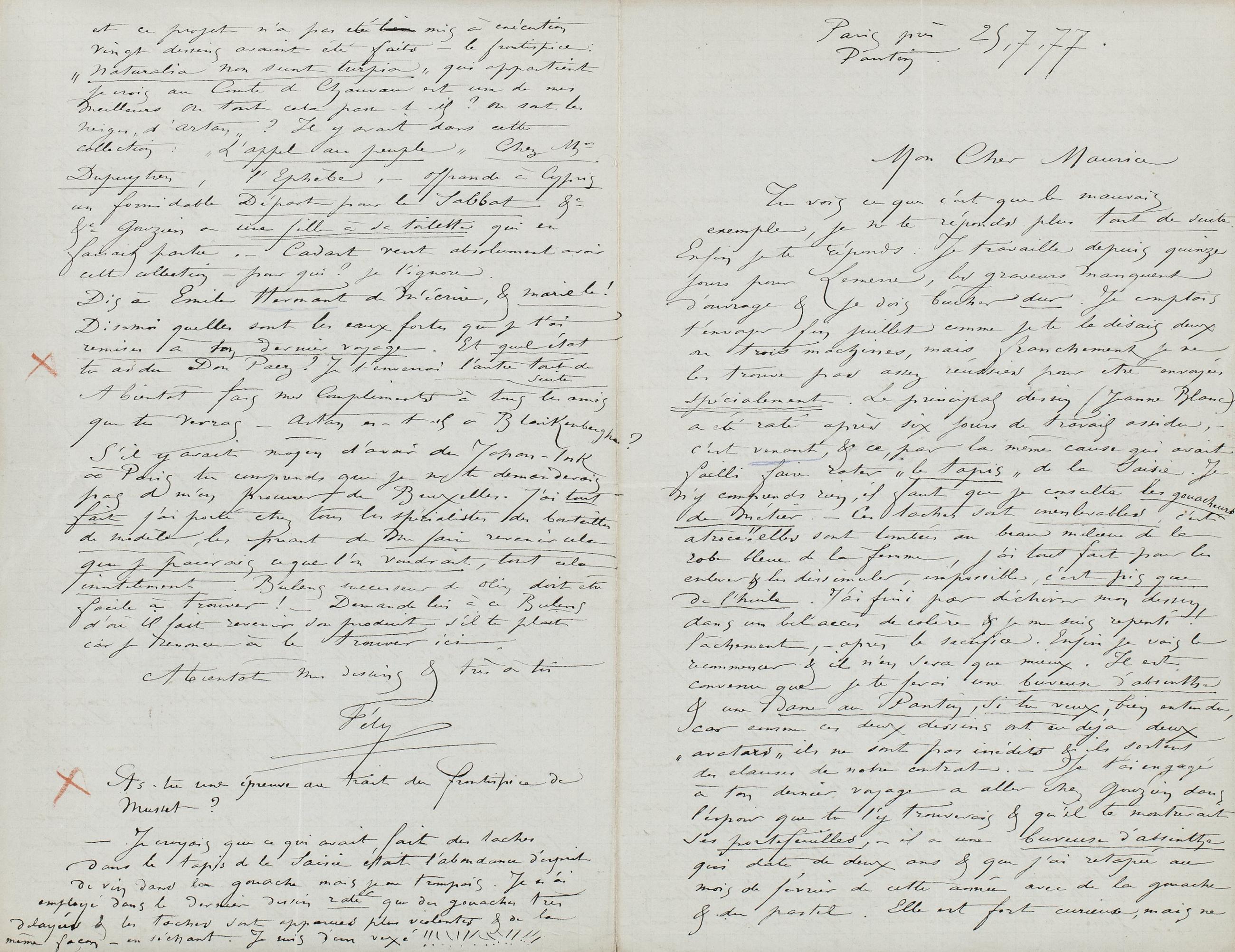 Tu vois ce que c’est que le mauvais exemple, je ne te réponds plus tout de suite. Enfin je te réponds : Je travaille depuis quinze jours pour Lemerre, les graveurs manquent d’ouvrage & je dois bûcher dûr. Je comptais t’envoyer fin juillet comme je te le disais deux ou trois machines, mais, franchement je ne les trouve pas assez réussies pour être envoyées spécialement. Le principal dessin (Jeanne Blanc) a été raté après six jours de travail assidu, – c’est vexant, & ce, par la même cause qui avait failli faire rater « le tapis » de la Saisie. Je n’y comprends rien, il faut que je consulte les gouacheurs de métier. – Ces taches sont inenlevables, c’est atroce !! elles sont tombées au beau milieu de la robe bleue de la femme, j’ai tout fait pour les enlever & les dissimuler, impossible, c’est pis que de l’huile. J’ai fini par déchirer mon dessin, dans un bel accès de colère & je me suis repenti ! lâchement, – après le sacrifice. Enfin je vais le recommencer & il n’en sera que mieux. Il est convenu que je te ferai une buveuse d’absinthe & une dame au Pantin, si tu veux, bien entendu, car comme ces deux dessins ont eu deja deux « avatars » ils ne sont pas inédits & ils sortent des clauses de notre contrat. – Je t’ai engagé à ton dernier voyage a aller chez Gouzien dans l’espoir que tu l’y trouverais & qu’il te montrerait ses portefeuilles, – il a une buveuse d’absinthe qui date de deux ans & que j’ai retapée au mois de février de cette année avec de la gouache & du pastel. Elle est fort curieuse, mais ne