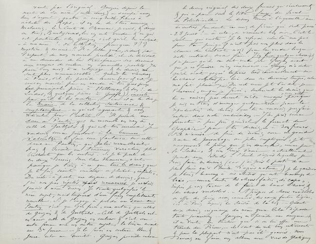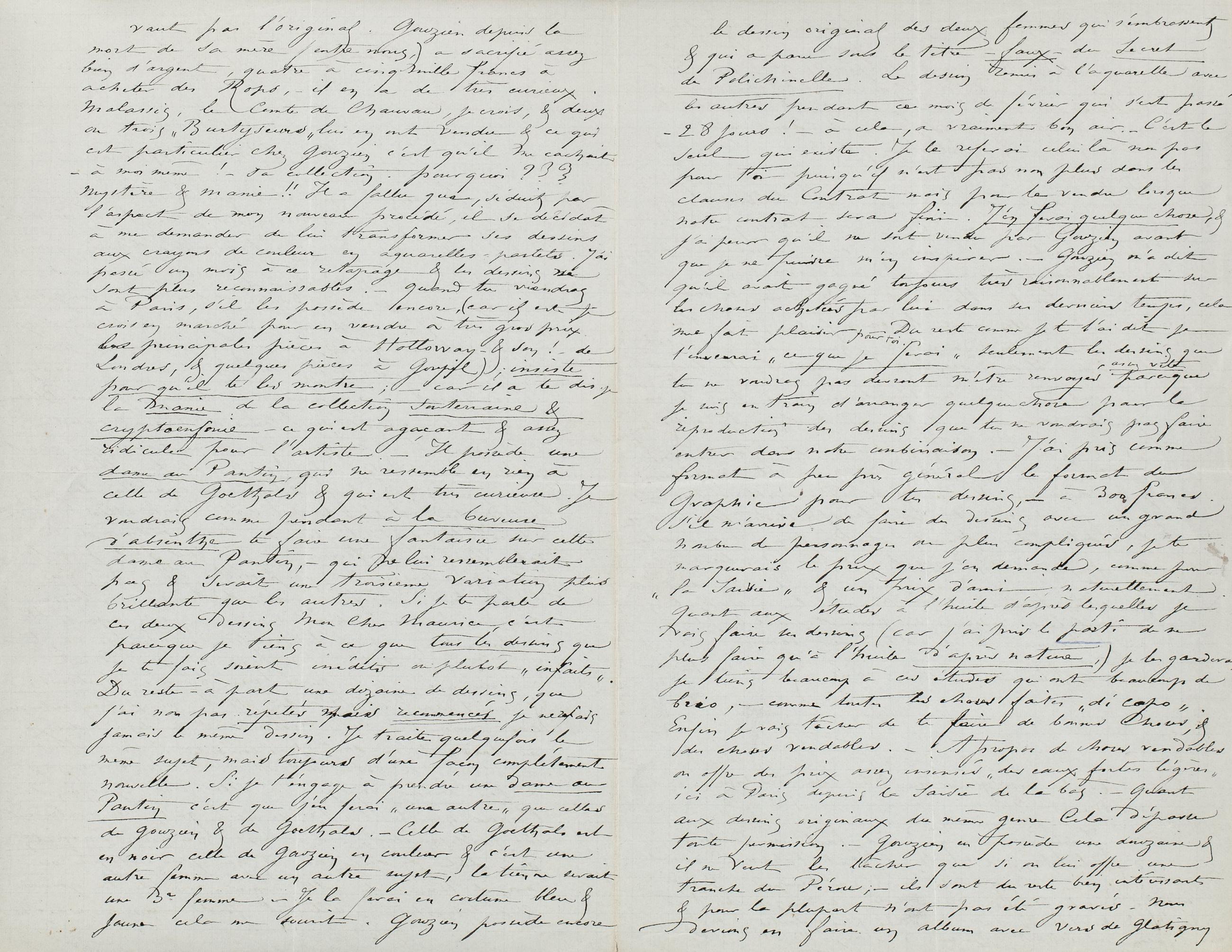vaut pas l’original. Gouzien depuis la mort de sa mère (entre nous,) a sacrifié assez bien d’argent, quatre à cinq mille francs à acheter des Rops, – il en a de très curieux. Malassis, le Comte de Chauvau, je crois, & deux ou trois « Burtyseurs » lui en ont vendu & ce qui est particulier chez Gouzien c’est qu’il me cachait – à moi-même ! – Sa collection. pourquoi ??? mystère & manie !! Il a fallu que, séduit par l’aspect de mon nouveau procédé, il se décidât à me demander de lui transformer ses dessins aux crayons de couleur en aquarelles-pastels. J’ai passé un mois à ce retapage & les dessins ne sont plus reconnaissables. – Quand tu viendras à Paris, s’il les possède encore, (car il est je crois en marché pour en vendre à très gros prix les principales pièces à Hollaway – & son ! – de Londres, & quelques pièces à Goupil) ; insiste pour qu’il te les montre ; – car il a te dis je la manie de la collection souterraine & cryptoenfouie – ce qui est agaçant & assez ridicule pour l’artiste. – Il possède une dame au Pantin, qui ne ressemble en rien à celle de Goethals & qui est très curieuse. Je voudrais comme pendant à la buveuse d’absinthe te faire une fantaisie sur cette dame au Pantin, – qui ne lui ressemblerait pas & serait une troisième variation plus brillante que les autres. Si je te parle de ces deux dessins Mon Cher Maurice, c’est parceque je tiens à ce que tous les dessins que je te fais soient inédits ou plutôt « infaits ». Du reste – à part une dizaine de dessins, que j’ai non pas répetés mais recommencés je ne refais jamais le même dessin. Je traite quelquefois le même sujet, mais toujours d’une façon complétement nouvelle. Si je t’engage à prendre une dame au Pantin c’est que j’en ferai « une autre » que celles de Gouzien & de Goethals. – Celle de Goethals est en noir celle de Gouzien en couleur & c’est une autre femme avec un autre sujet, la tienne serait une 3e femme – Je la ferai en costume bleu & jaune cela me sourit. Gouzien possède encore