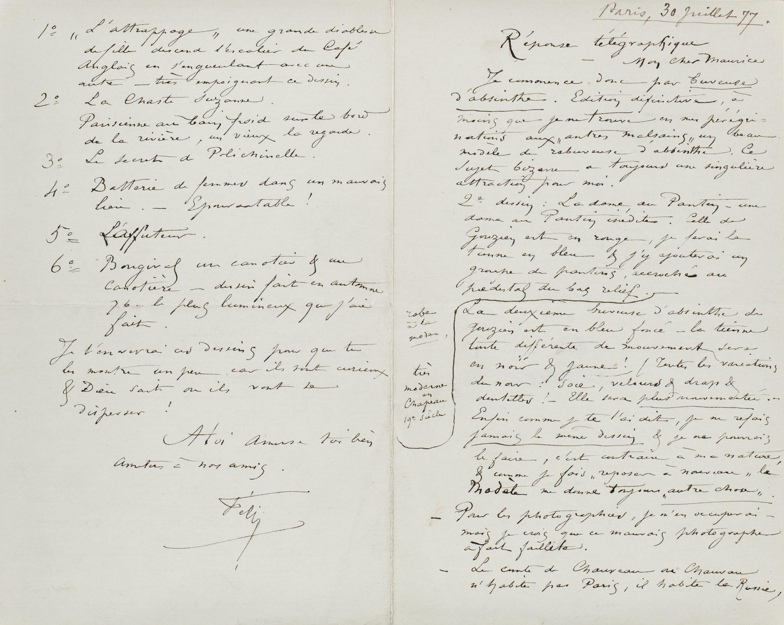 La deuxième buveuse d’absinthe de Gouzien est en bleu foncé – la tienne toute différente de mouvement sera en noir & jaune ! (Toutes les variations du noir : soie, velours & drap & dentelles ! – Elle sera plus mouvementée. – Enfin comme je te l’ai dit, je ne refais jamais le même dessin & je ne pourrais le faire, c’est contraire à ma nature, & comme je fais « reposer à nouveau » le modèle me donne toujours « autre chose ».