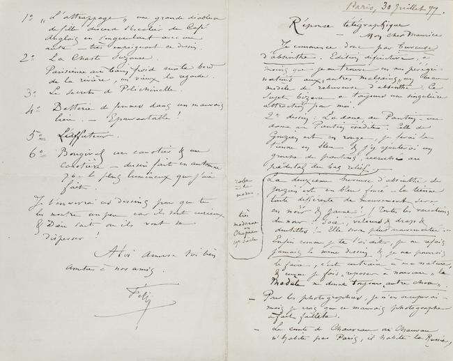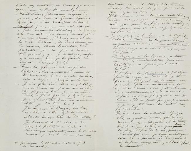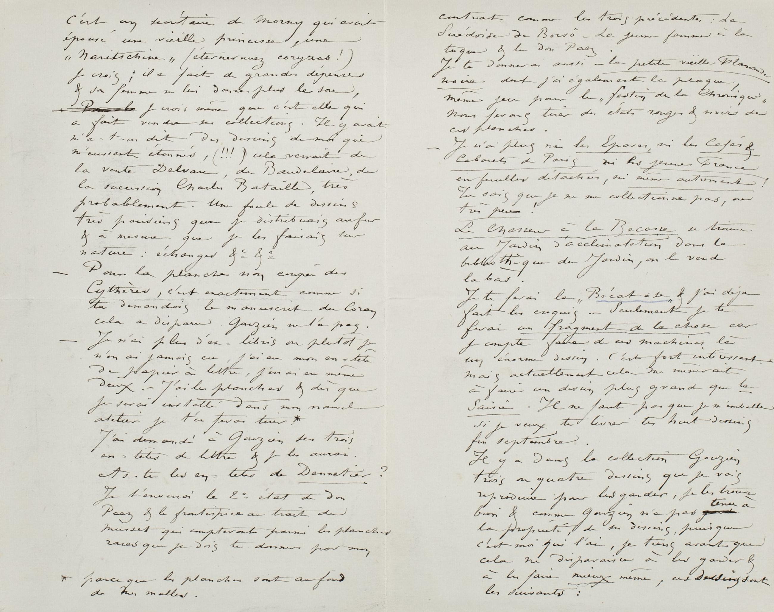 C’est un secrétaire de Morny qui avait épousé une vieille princesse, une « Naritschine » (éternuez coryzas !) je crois ; il a fait de grandes dépenses & sa femme ne lui donne plus le sou, Pour le je crois même que c’est elle qui a fait vendre ses collections. Il y avait m’a-t-on dit des dessins de moi qui m’eussent étonnés, (!!!) cela venait de la vente Delvau, de Baudelaire, de la succession Charles Bataille, très probablement. Une foule de dessins très parisiens que je distribuais au fur & à mesure que je les faisais sur nature : échanges &c &c