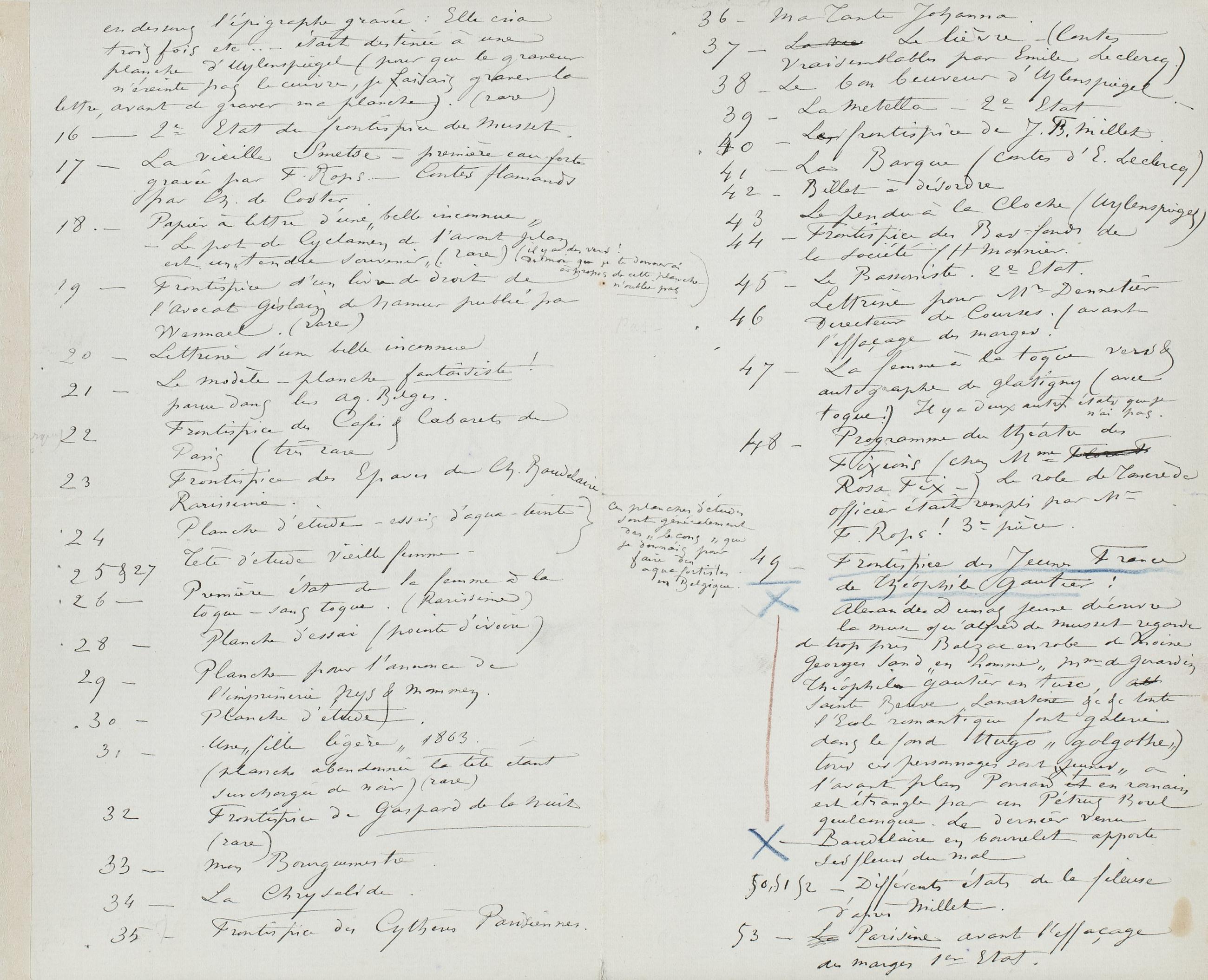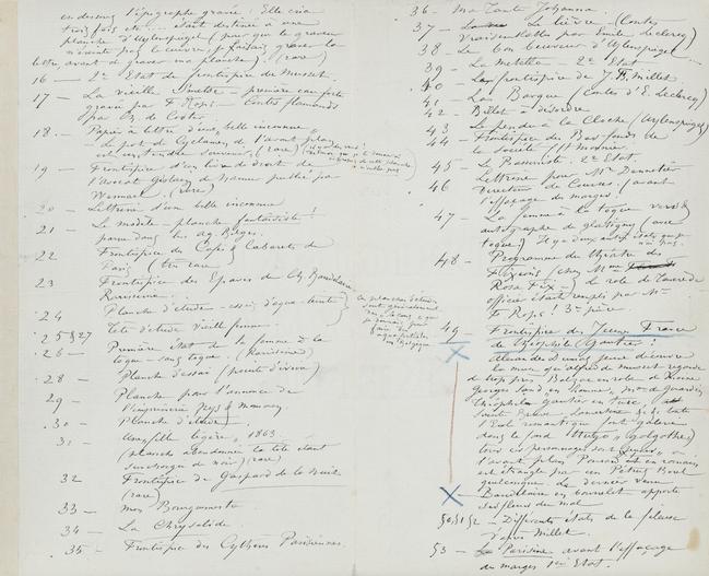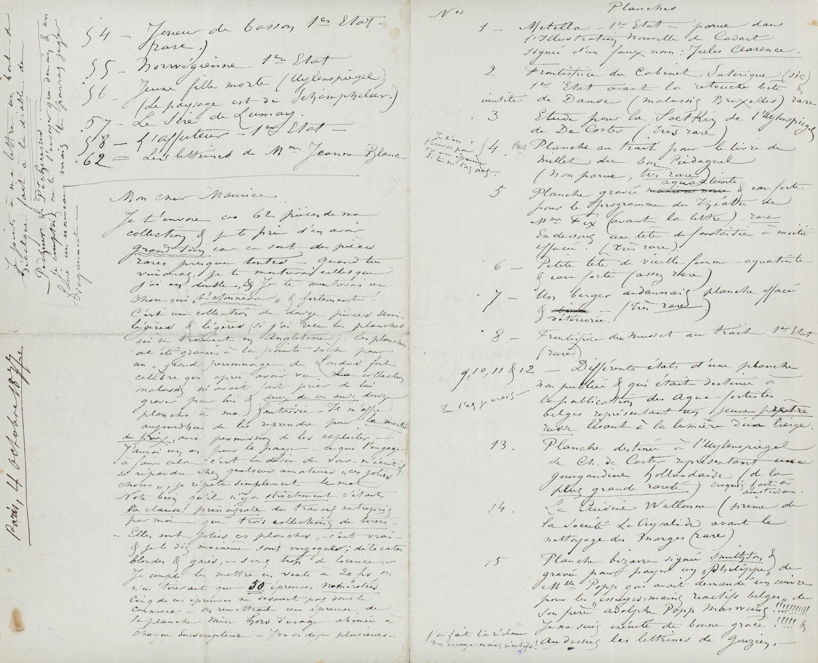 – Elles sont jolies ces planches, – c’est vrai – & je le dis moimême sans vergognes ; délicates blondes & gaies, – sans trop de licence. – Je compte les mettre en vente à 20 frs on n’en tirerait que 50 épreuves numérotées Cinq de ces épreuves ne seraient pas dans le commerce – On remettrait une épreuve de la planche mise hors d’usage – abîmée à chaque souscripteur – J’en ai deja plusieurs –