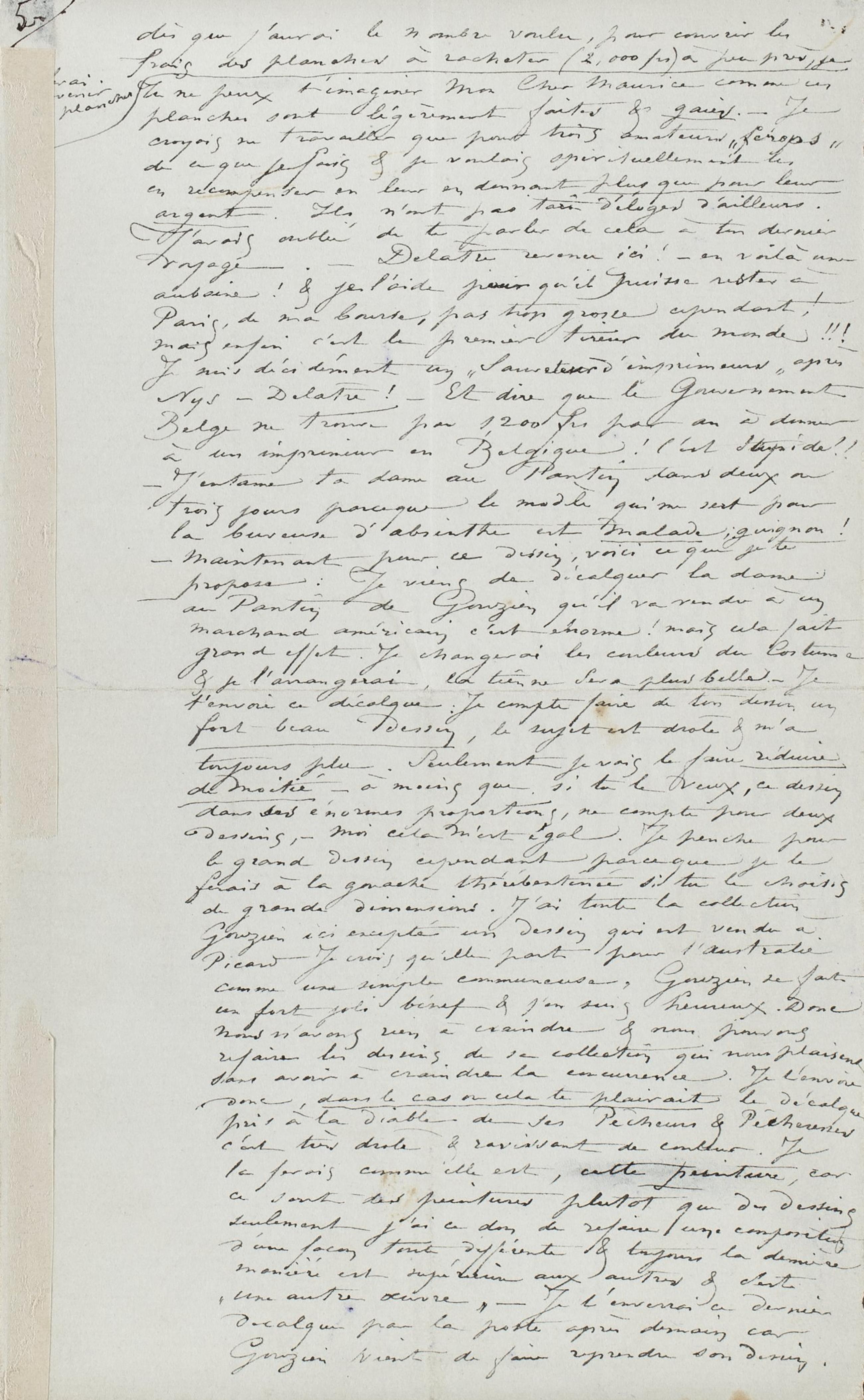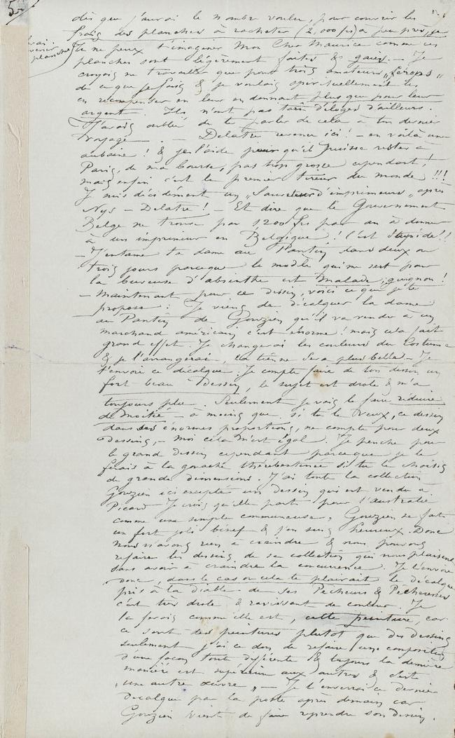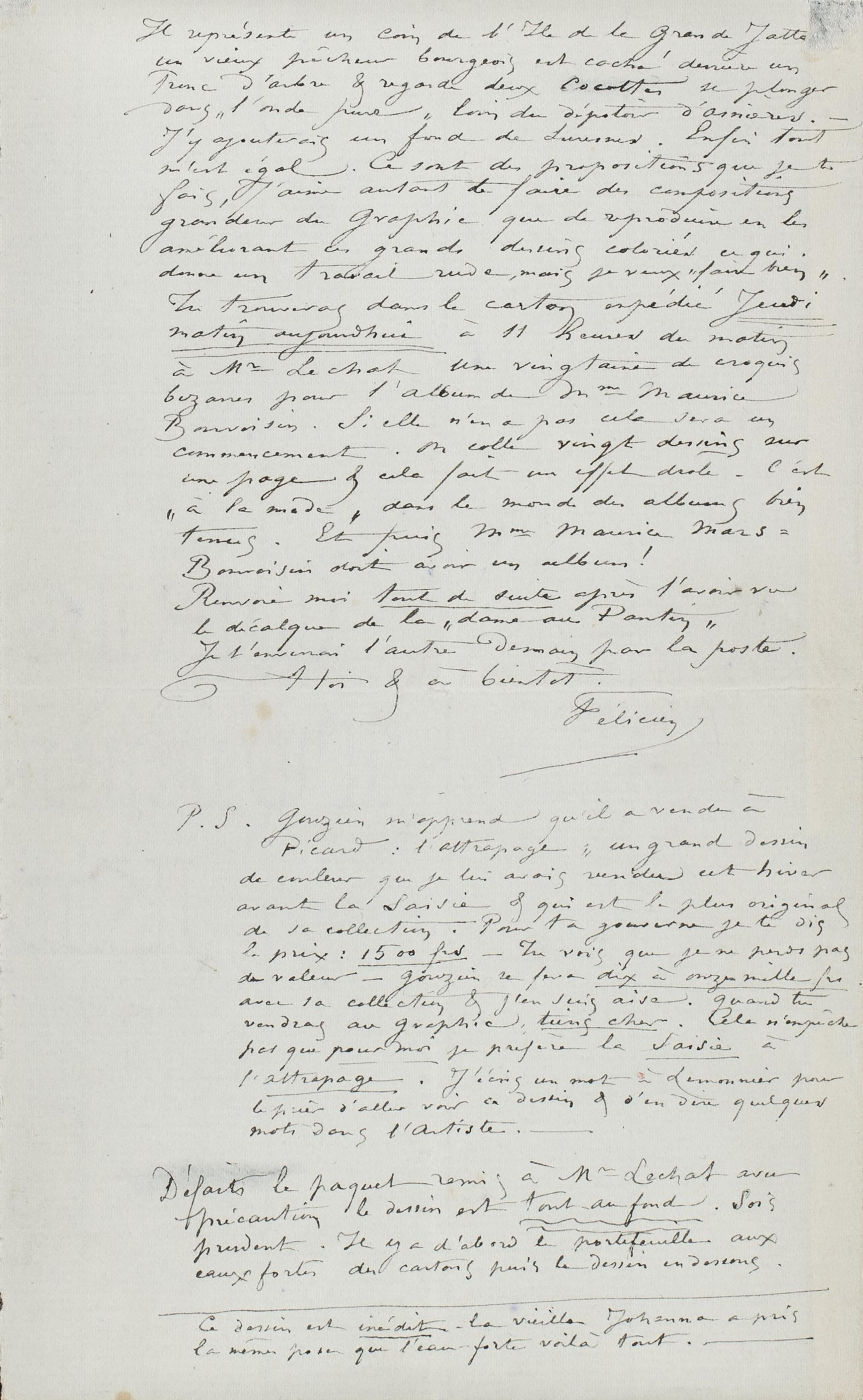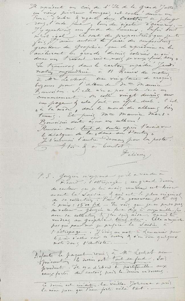 P.S. Gouzien m’apprend qu’il a vendu à Picard : l’attrapage » un grand dessin de couleur que je lui avais vendu cet hiver avant la Saisie & qui est le plus original de sa collection. Pour ta gouverne je te dis le prix : 1500 frs – Tu vois que je ne perds pas de valeur – Gouzien se fera dix à onze mille frs. avec sa collection & j’en suis aise. Quand tu vendras au Graphic, tiens cher. Cela n’empêche pas que pour moi je préfère la Saisie à l’attrapage. J’écris un mot à Lemonnier pour le prier d’aller voir ce dessin & d’en dire quelques mots dans l’Artiste. –