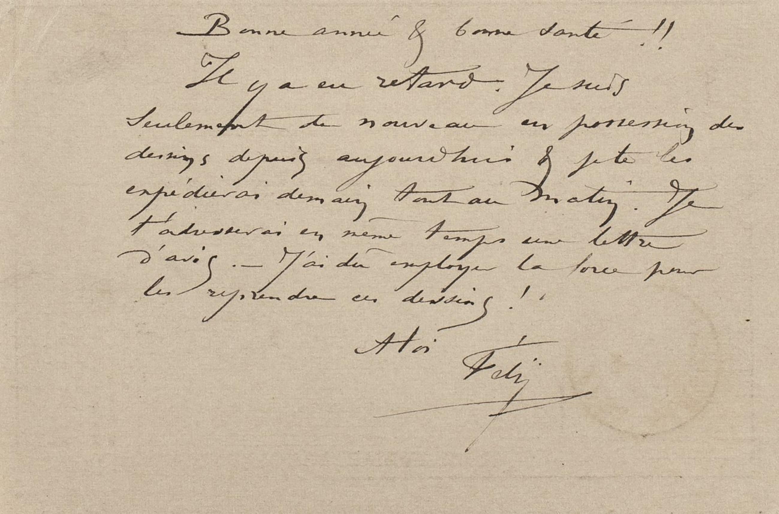 Il y a eu retard. Je suis seulement de nouveau en possession des dessins depuis aujourdhui & je te les expédierai demain tout au matin. Je t’adresserai en même temps une lettre d’avis. – J’ai dû employer la force pour les reprendre ces dessins !