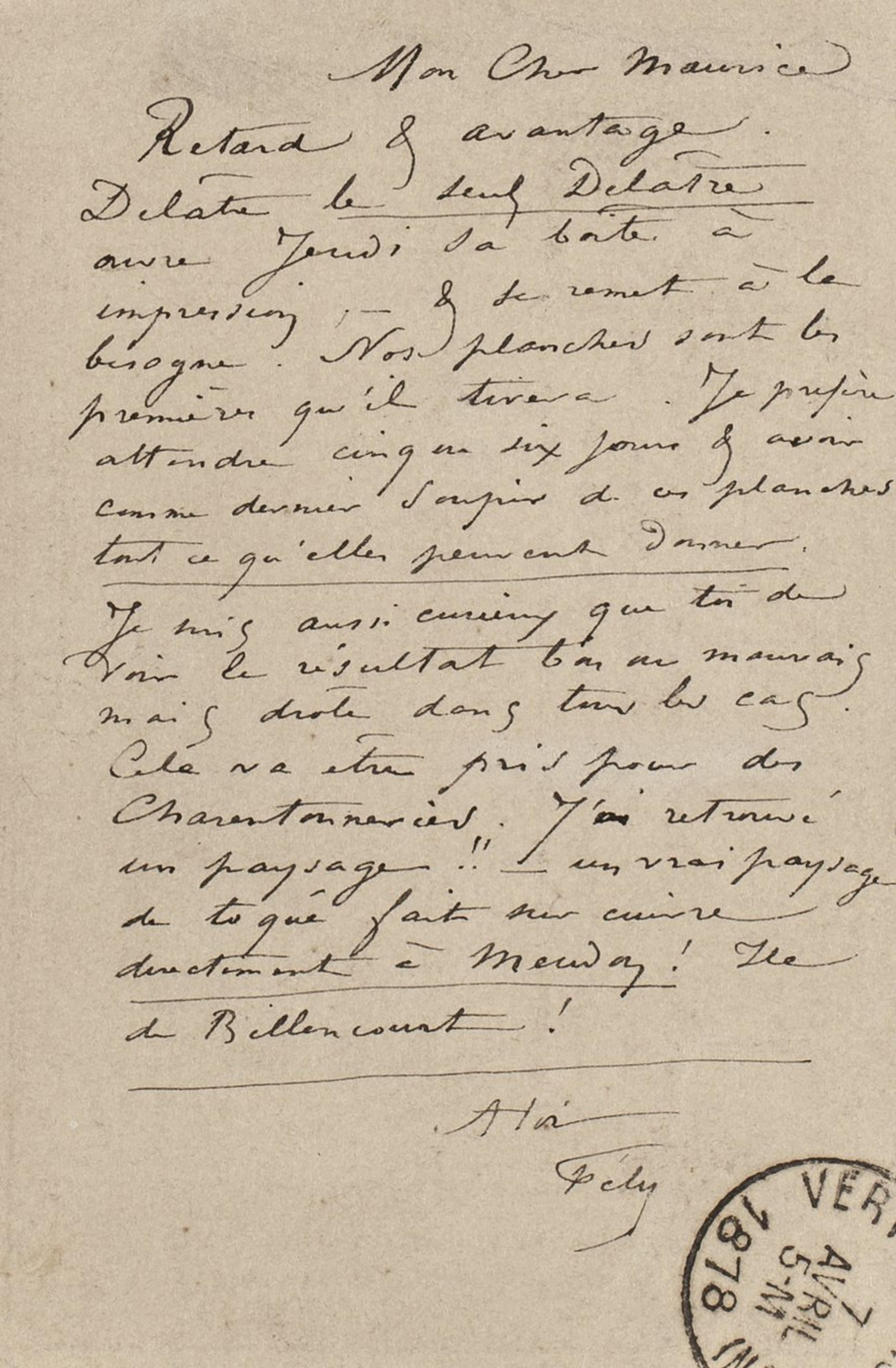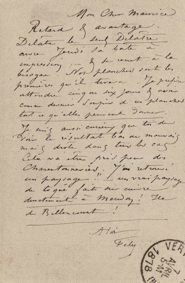 Retard & avantage. Delâtre le seul Delâtre ouvre Jeudi sa boîte à impression, – & se remet à la besogne. Nos planches sont les premières qu’il tirera. Je prefère attendre cinq ou six jours & avoir comme dernier soupir de ces planches tout ce qu’elles peuvent donner.
