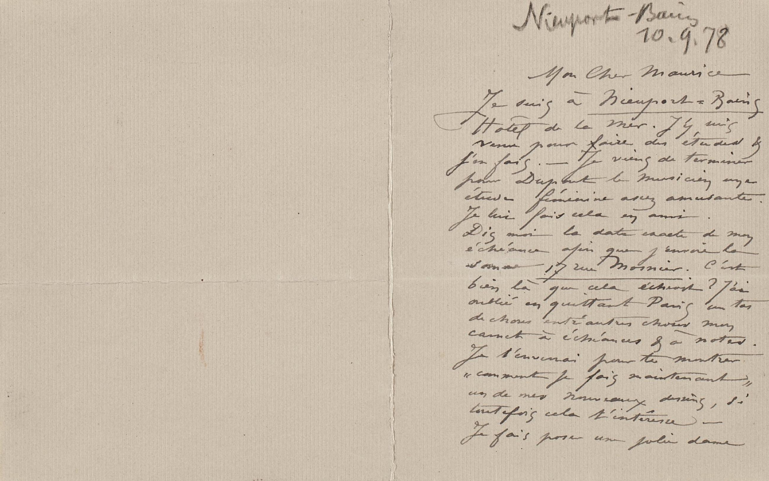 Je suis à Nieuport-Bains Hôtel de la Mer. J’y suis venu pour faire des études & j’en fais. – Je viens de terminer pour Dupont le musicien une étude féminine assez amusante. Je lui fais cela en ami.