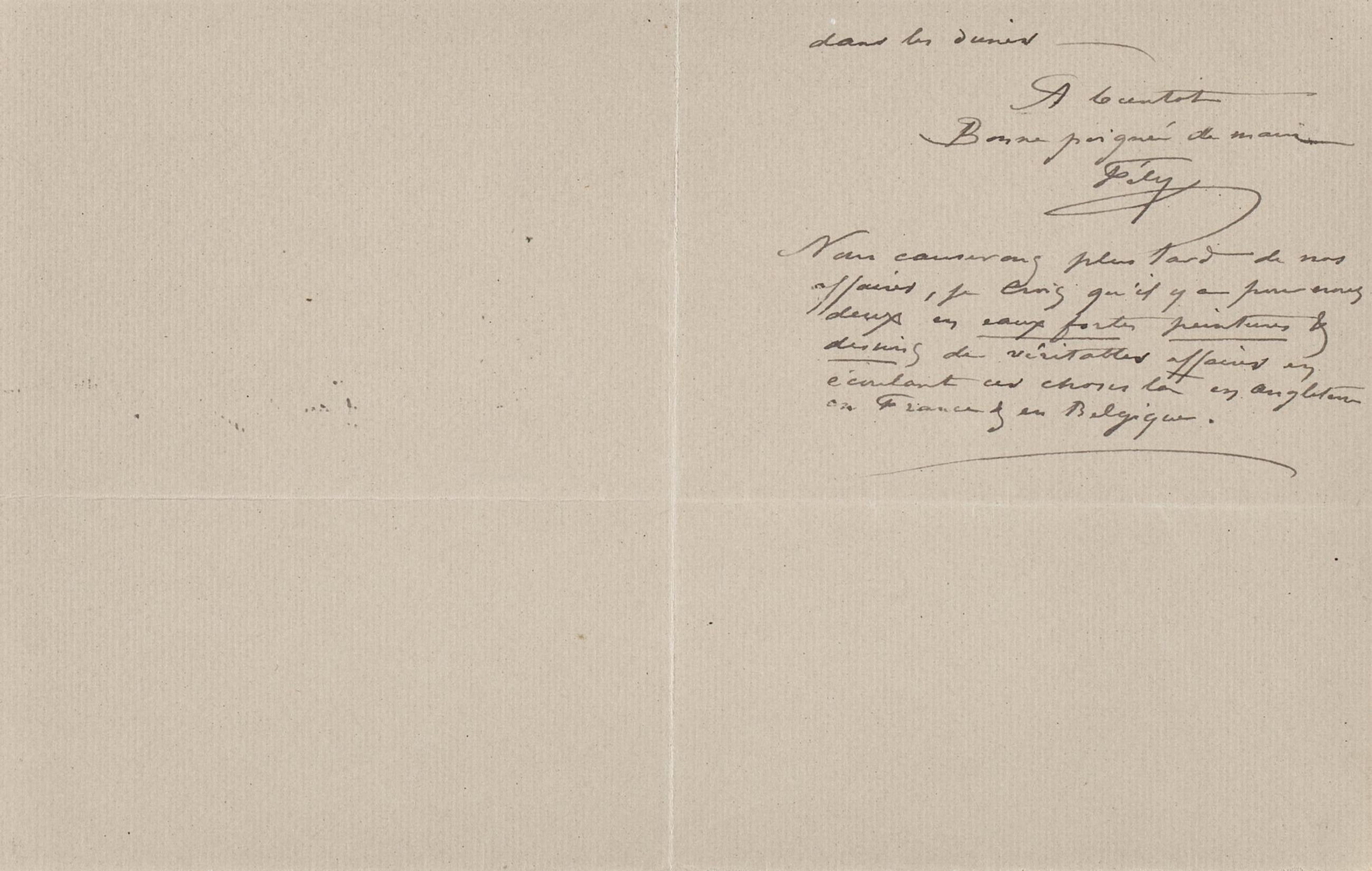 Nous causerons plus tard de nos affaires, je crois qu’il y a pour nous deux en eaux fortes peintures & dessins de véritables affaires en écoulant ces choses là en Angleterre en France & en Belgique.