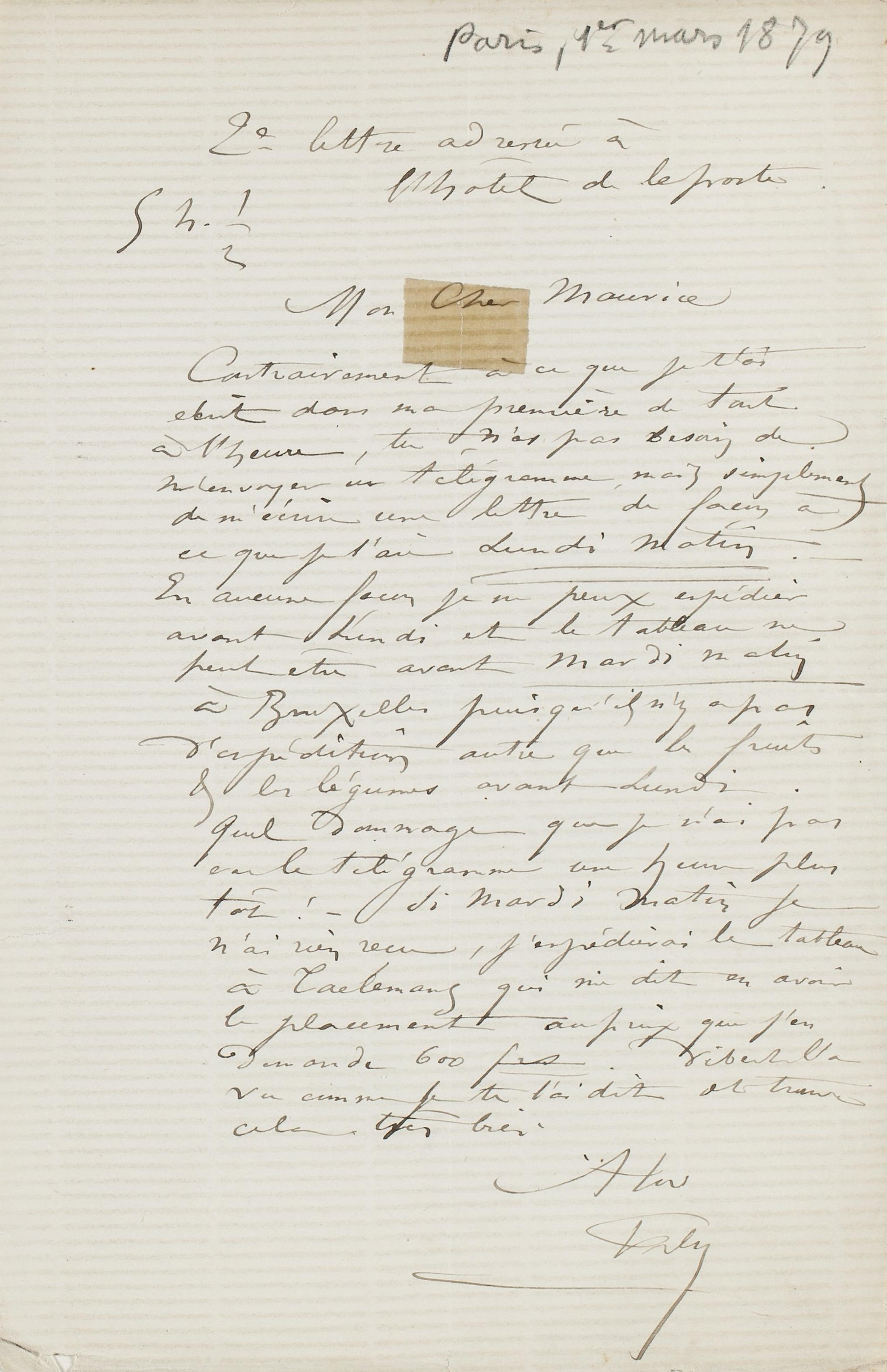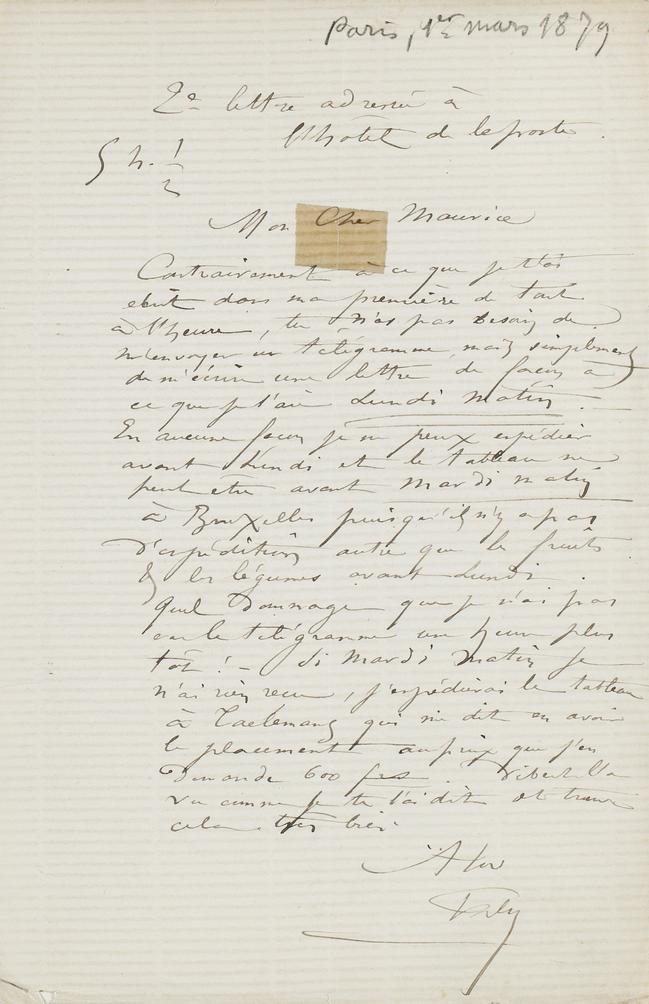 Contrairement à ce que je t’ai écrit dans ma première de tout à l’heure, tu n’as pas besoin de m’envoyer un télégramme, mais simplement de m’écrire une lettre de façon à ce que je l’aie Lundi matin. ‒ En aucune façon je ne peux expédier avant Lundi et le tableau ne peut être avant Mardi matin à Bruxelles puisqu’il n’y a pas d’expédition autre que les fruits & légumes avant Lundi. Quel dommage que je n’ai pas eu le telégramme une heure plus tôt ! ‒ Si Mardi matin je n’ai rien reçu, j’expédierai le tableau à Taelemans qui me dit en avoir le placement au prix que j’en demande 600 frs. Vibert l’a vu comme je te l’ai dit et trouve cela très bien.
