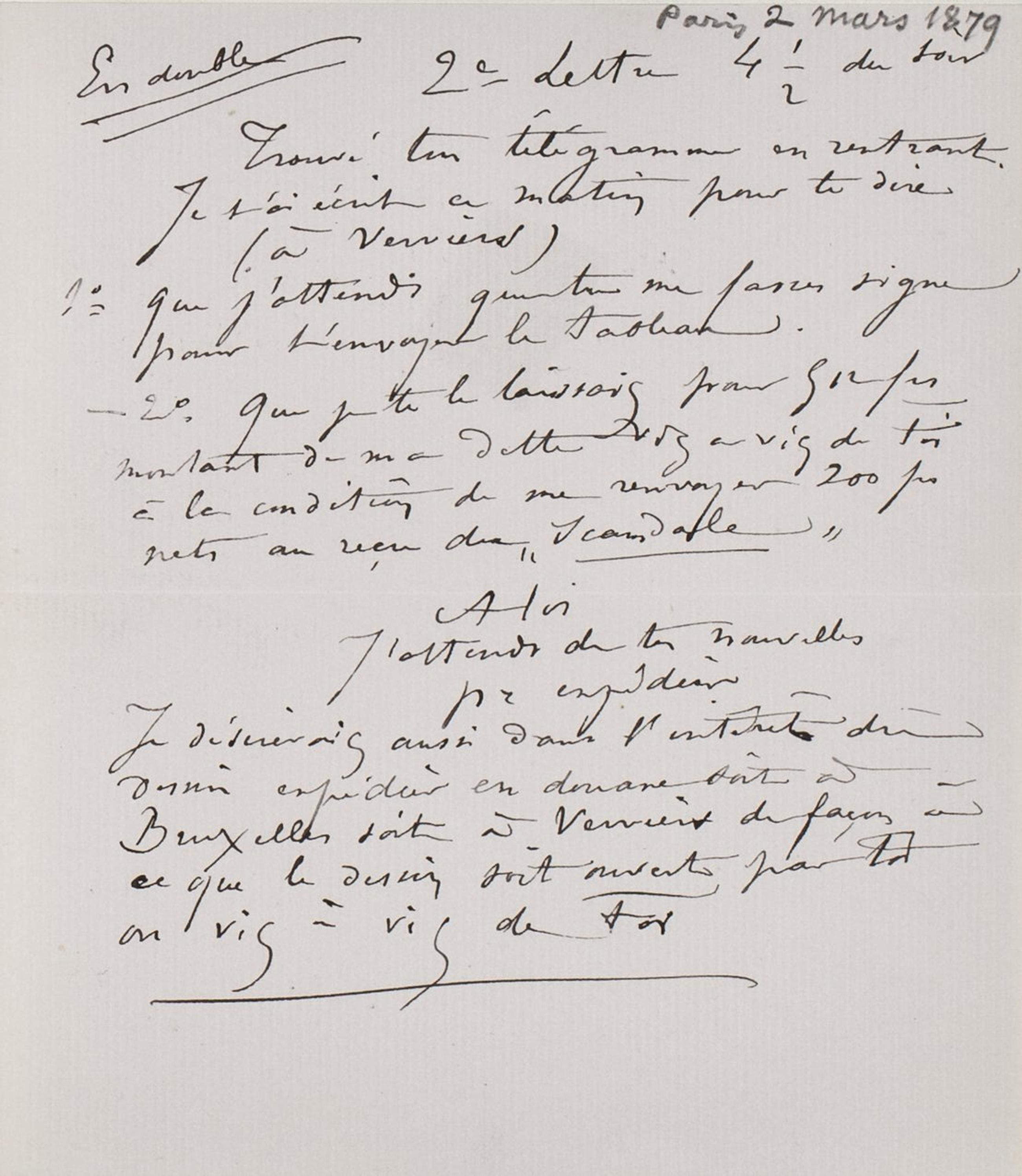 ‒ 2°que je te laissais pour 512 frs montant de ma dette vis a vis de toi à la condition de me renvoyer 200 frs nets au reçu du «Scandale »