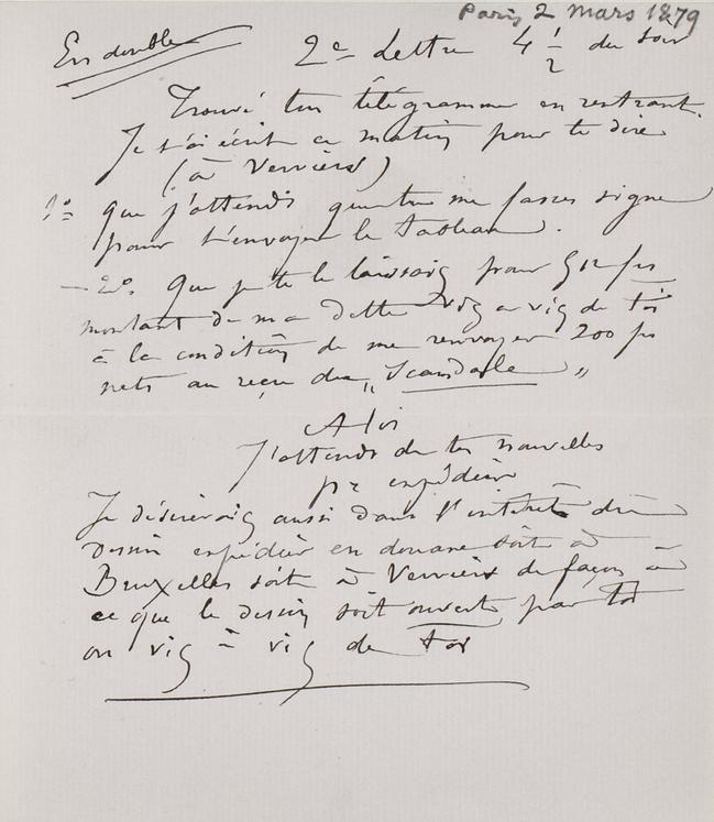 Je désirerais aussi dans l’intérêt du dessin expédier en douane soit à Bruxelles soit à Verviers de façon à ce que le dessin soit ouvert par toi ou vis à vis de toi
