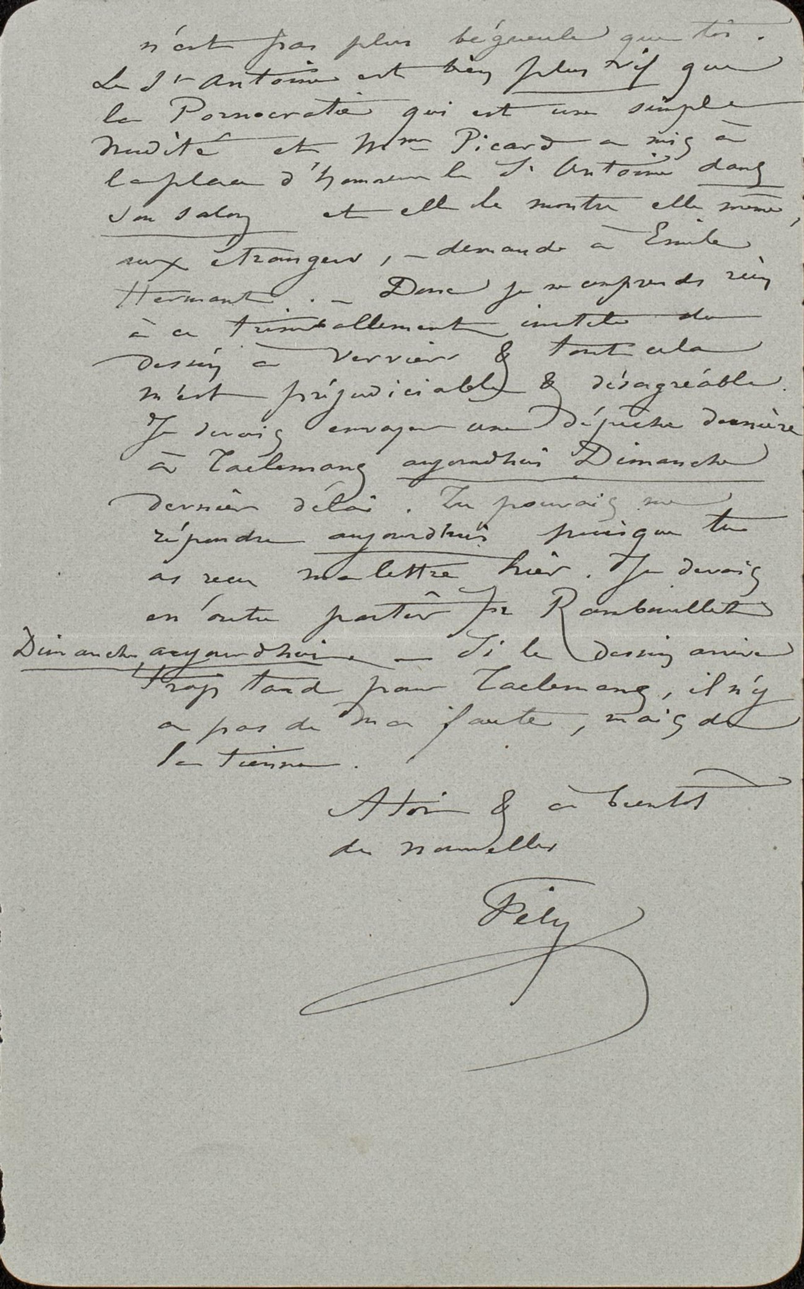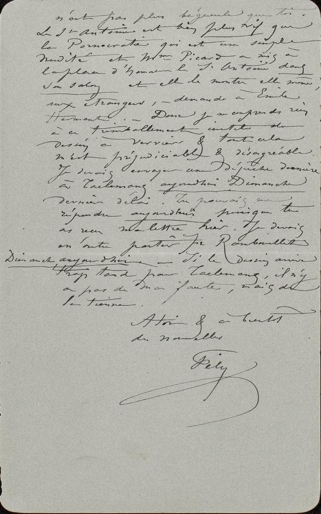 n’est pas plus bégueule que toi. Le St Antoine est bien plus vif que la Pornocratie qui est une simple nudité et Mme Picard a mis à la place d’honneur le St Antoine dans son salon et elle le montre elle-même, aux étrangers, ‒ demande à Émile Hermant. ‒ Donc je ne comprends rien à ce trimballement inutile du dessin à Verviers & tout cela m’est préjudiciable & désagréable. Je devais envoyer une dépêche dernière à Taelemansaujourd’hui Dimanche dernier délai. Tu pouvais me répondre aujourdhui puisque tu as reçu ma lettre hier. Je devais en outre partir pour RambouilletDimanche, aujourdhui. ‒ Si le dessin arrive trop tard pour Taelemans, il n’y a pas de ma faute, mais de la tienne.