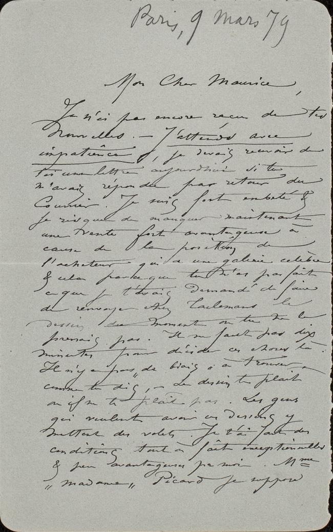 Je n’ai pas encore reçu de tes nouvelles. ‒ J’attends avec impatience, je devais recevoir de toi une lettre aujourdhui si tu m’avais répondu par retour du courrier. Je suis fort embeté & je risque de manquer maintenant une vente fort avantageuse à cause de la position de l’acheteur qui a une galerie celèbre & cela parce que tu n’as pas fait ce que je t’avais demandé de faire de renvoyer chez Taelemans le dessin du moment où tu ne le prenais pas. Il ne faut pas dix minutes pour décider ces choses là. Il n’y a pas « de biais » à trouver, comme tu dis, ‒ Le dessin te plaît ou il ne te plaît pas. Les gens qui veulent avoir ces dessins y mettent des volets. Je t’ai fait des conditions tout à fait exceptionnelles & peu avantageuses pour moi. Mme « Madame » Picard je suppose