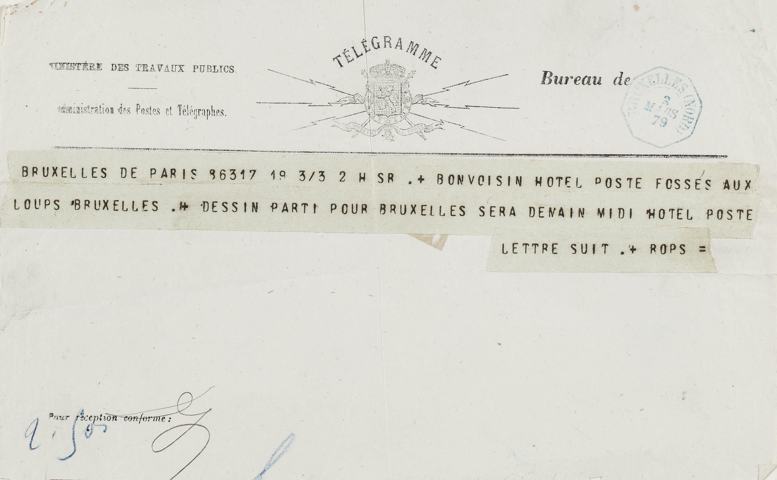 BRUXELLES DE PARIS 86317 19 3/3 2 H SR. + BONVOISINHÔTEL POSTE FOSSES AUX LOUPS BRUXELLES. + DESSIN PARTI POUR BRUXELLES SERA DEMAIN MIDI HÔTEL POSTE LETTRE SUIT. + ROPS =