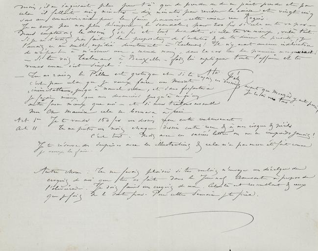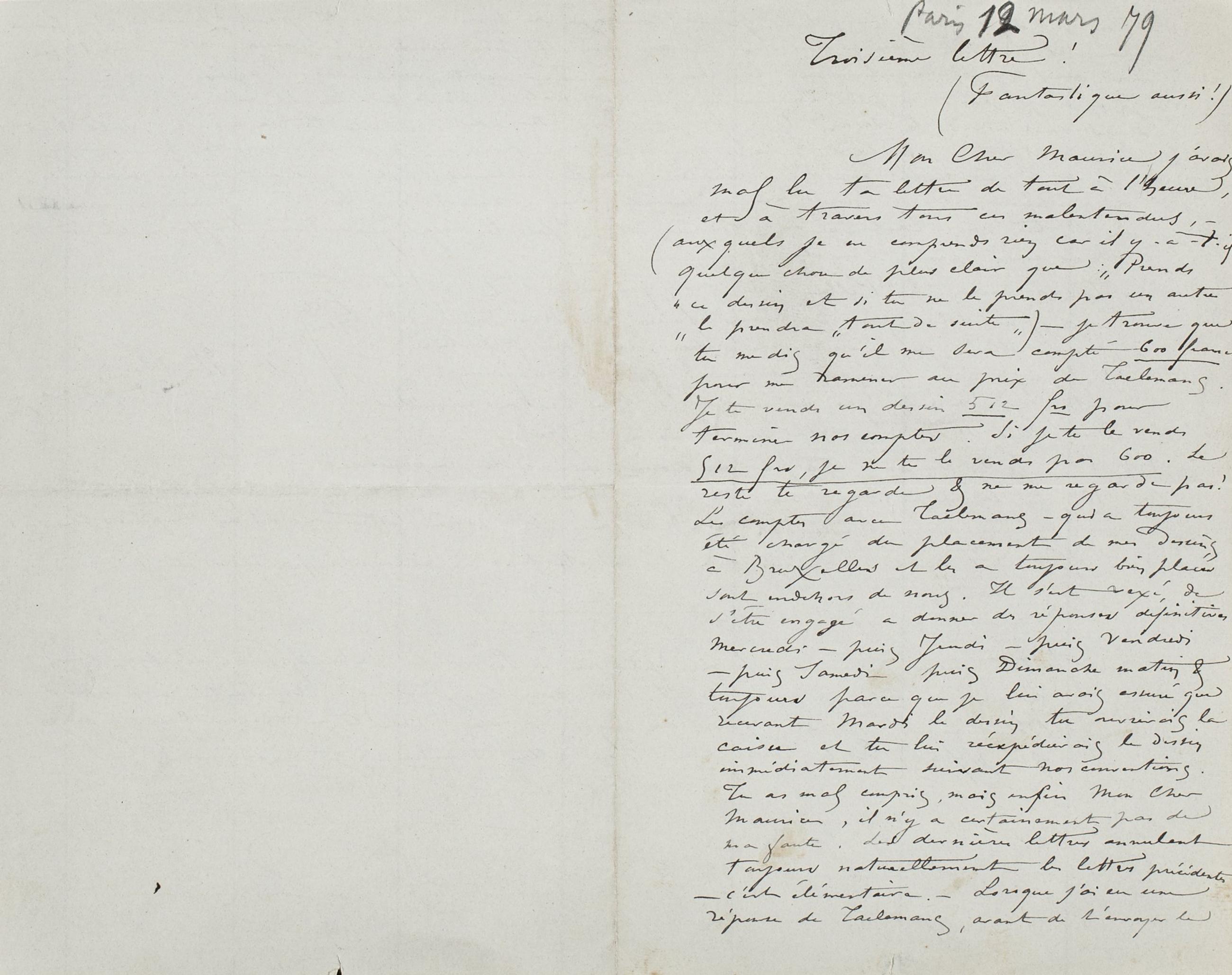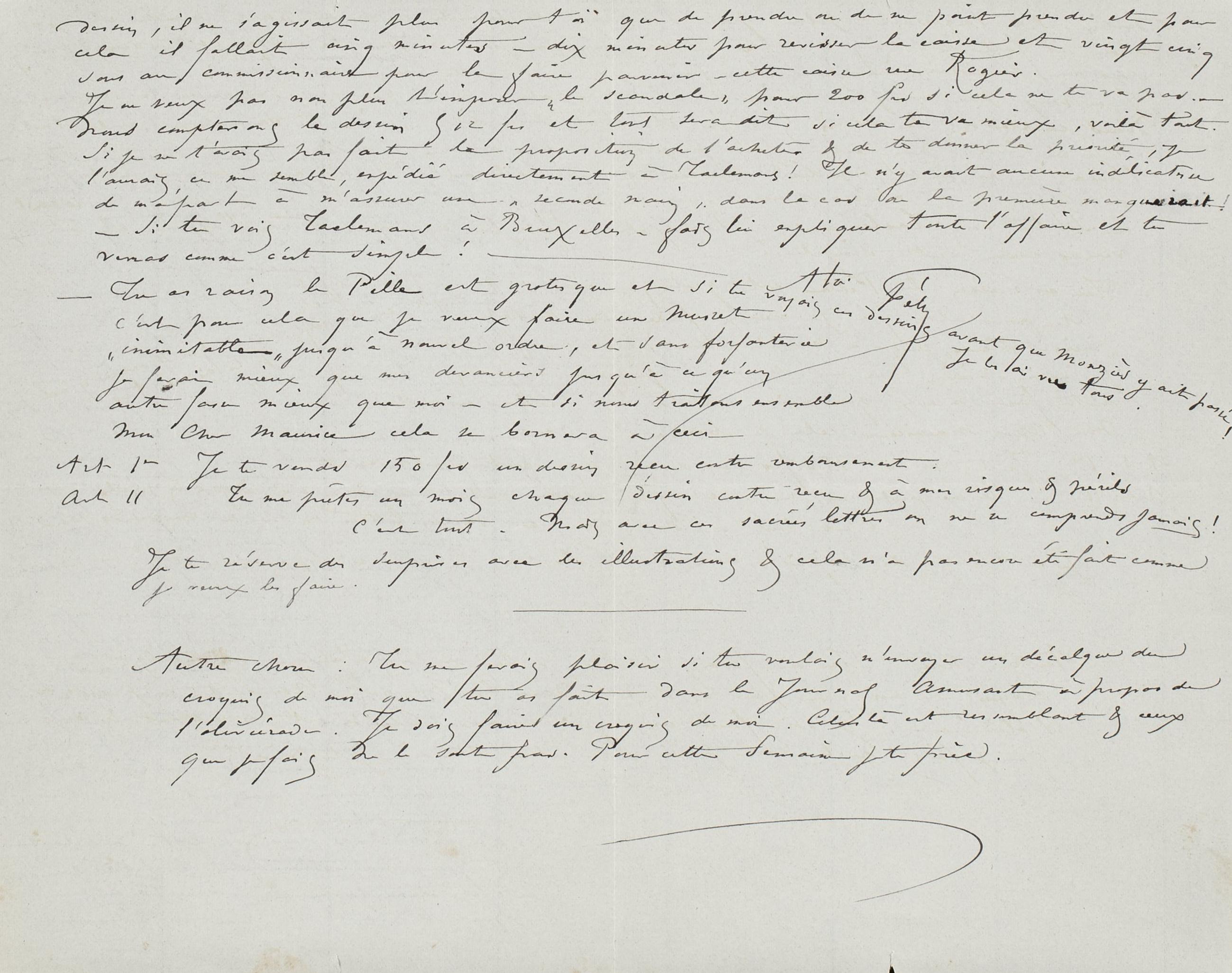 j’avais mal lu ta lettre de tout à l’heure, et à travers tous ces malentendus,‒ (auxquels je ne comprends rien car il y-a-t-il quelque chose de plus claire que : « Prends ce dessin et si tu ne le prends pas un autre le prendra « tout de suite ») – je trouve que tu me dis qu’il me sera compté 600 francs pour me ramener au prix de Taelemans. Je te vends un dessin 512 frs pour terminer nos comptes. Si je te le vends 512 frs, je ne te le vends pas 600. Le reste te regarde & ne me regarde pas ! Les comptes avec Taelemans ‒ qui a toujours été chargé du placement de mes dessins à Bruxelles et les a toujours bien placés sont endehors de nous. Il s’est vexé, de s’être engagé a donner des réponses définitives Mercredi – puis Jeudi – puis Vendredi – puis Samedi puis Dimanche matin & toujours parce que je lui avais assuré que recevant Mardi le dessin tu ouvrirais la caisse et tu lui réexpédierais le dessin immédiatement suivant nos conventions. Tu as mal compris, mais enfin Mon Cher Maurice, il n’y a certainement pas de ma faute.