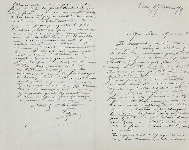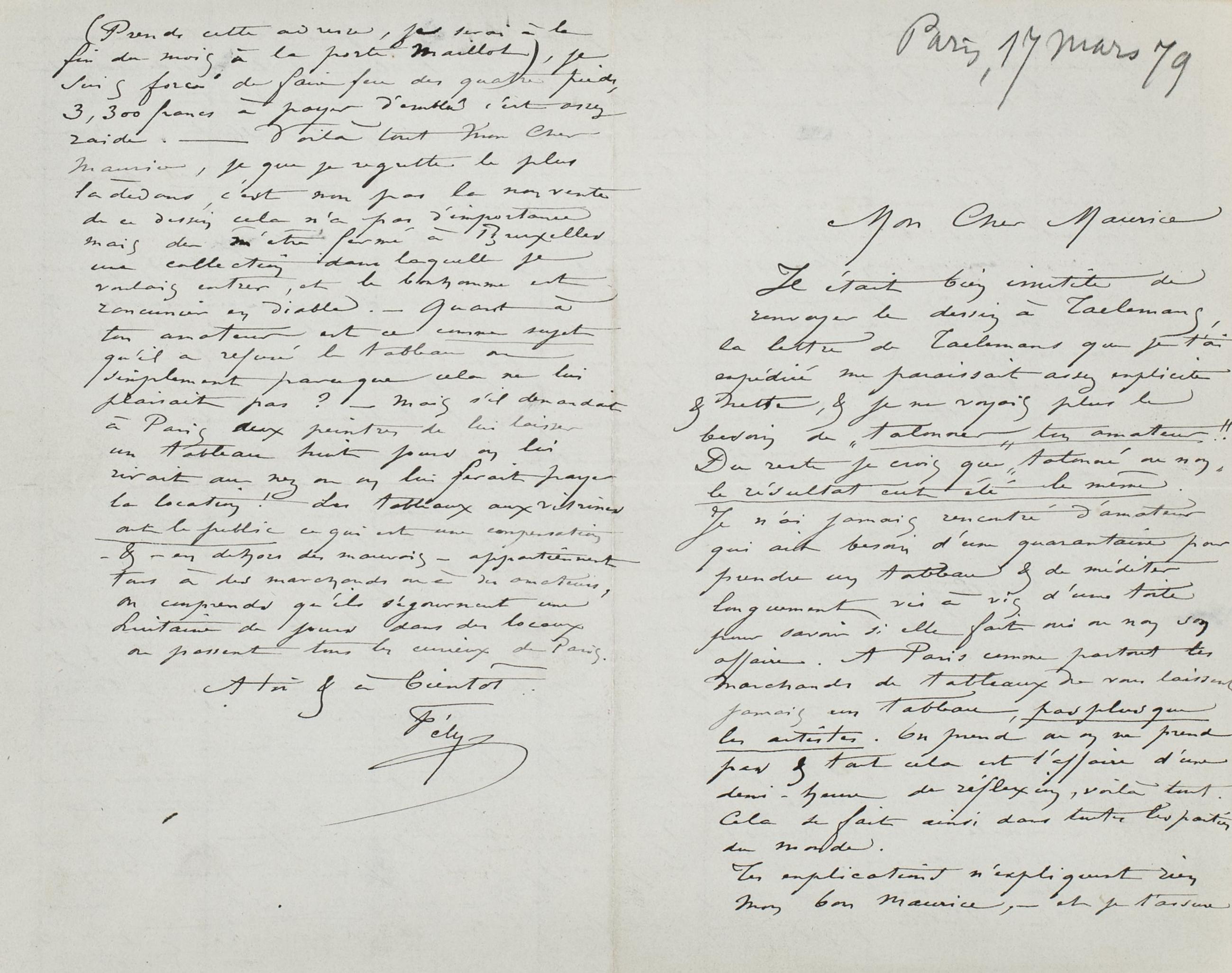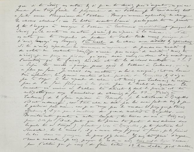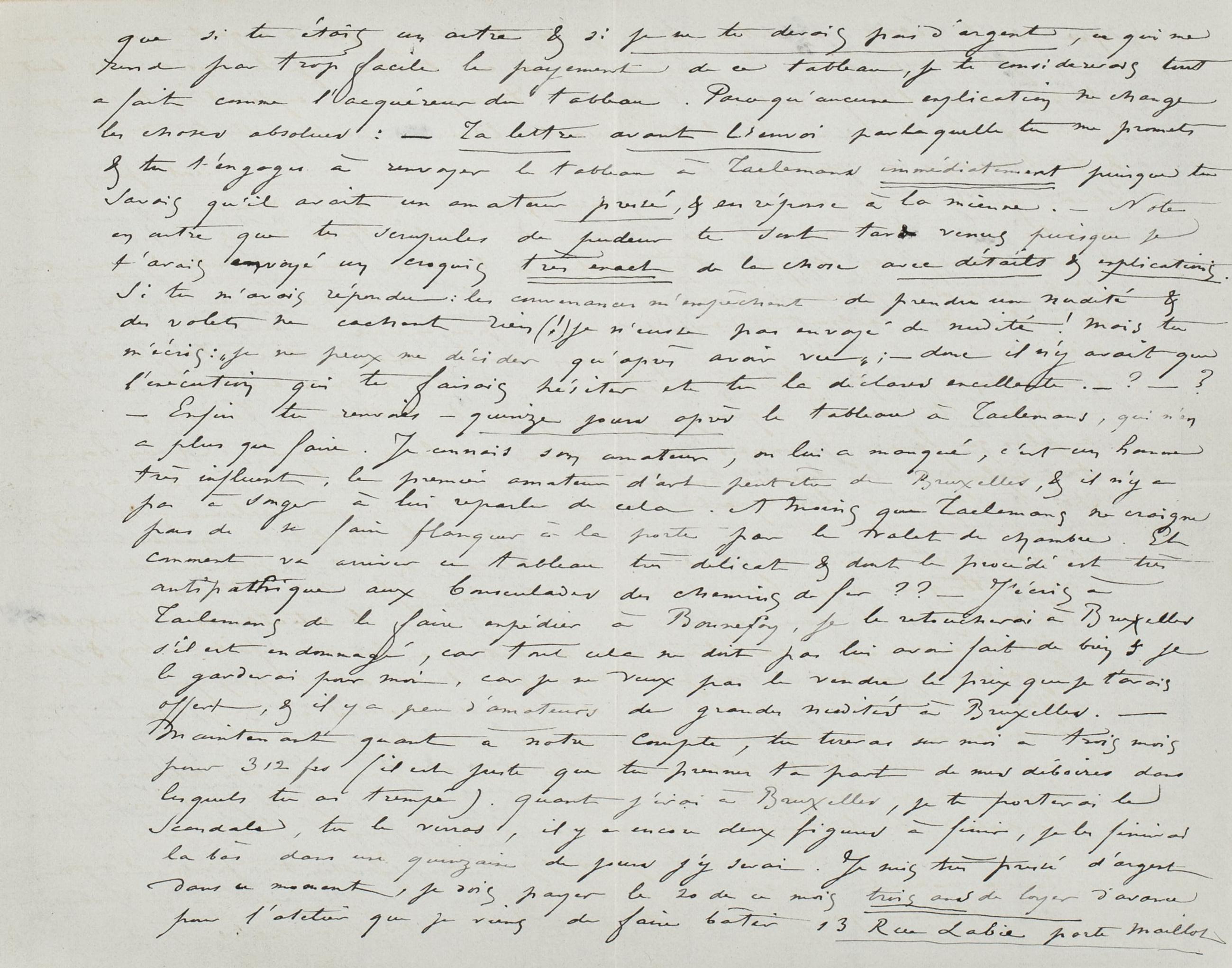 que si tu étais un autre & si je ne te devais pas d’argent, ce qui ne rend pas trop facile le payement de ce tableau, je te considererais tout a fait comme l’acquéreur du tableau. Parce qu’aucune explication ne change les choses absolues : ‒ Ta lettre avant l’envoi par laquelle tu me promets & tu t’engages à renvoyer le tableau à Taelemansimmédiatement puisque tu savais qu’il avait un amateur pressé, & en réponse à la mienne. ‒ Note en outre que tes scrupules de pudeur te sont tard venus puisque je t’avais envoyé un croquis très exact de la chose avec détails & explications. Si tu m’avais répondu : les convenances m’empêchent de prendre une nudité & des volets ne cachent rien (!) je n’eusse pas envoyer de nudité ! Mais tu m’écris : « je ne peux me décider qu’après avoir vu » ; donc il n’y avait que l’exécution qui te faisais hésiter et tu la déclares excellente. ‒ ? ‒ ? ‒ Enfin tu renvoies – quinze jours après le tableau à Taelemans, qui n’en a plus que faire. Je connais son amateur, on lui a manqué, c’est un homme très influent, le premier amateur d’art peut être de Bruxelles, & il n’y a pas à songer à lui reparler de cela. À moins que Taelemans ne craigne pas de se faire flanquer à la porte par le valet de chambre. Et comment va arriver ce tableau très délicat & dont le procédé est très antipathique aux bousculades des chemins de fer ?? ‒ J’écris à Taelemans de le faire expédier à Bonnefoy, je le retoucherai à Bruxelles s’il est endommagé, car tout cela ne doit pas lui avoir fait du bien& je le garderai pour moi, car je ne veux pas le vendre le prix que je t’avais offert, & il y a peu d’amateurs de grandes nudités à Bruxelles. ‒ Maintenant quant à notre compte, tu tireras sur moi à trois mois pour 312 frs (il est juste que tu prennes ta part de mes déboires dans lesquels tu as trempé). Quand j’irai à Bruxelles, je te porterai le Scandale, tu le verras, il y a encore deux figures à finir, je les finirai la bàs dans une quinzaine de jours j’y serai. Je suis très pressé d’argent dans ce moment, je dois payer le 20 de ce mois trois ans de loyer d’avance pour l’atelier que je viens de faire bâtir 13 Rue Labie porte Maillot
