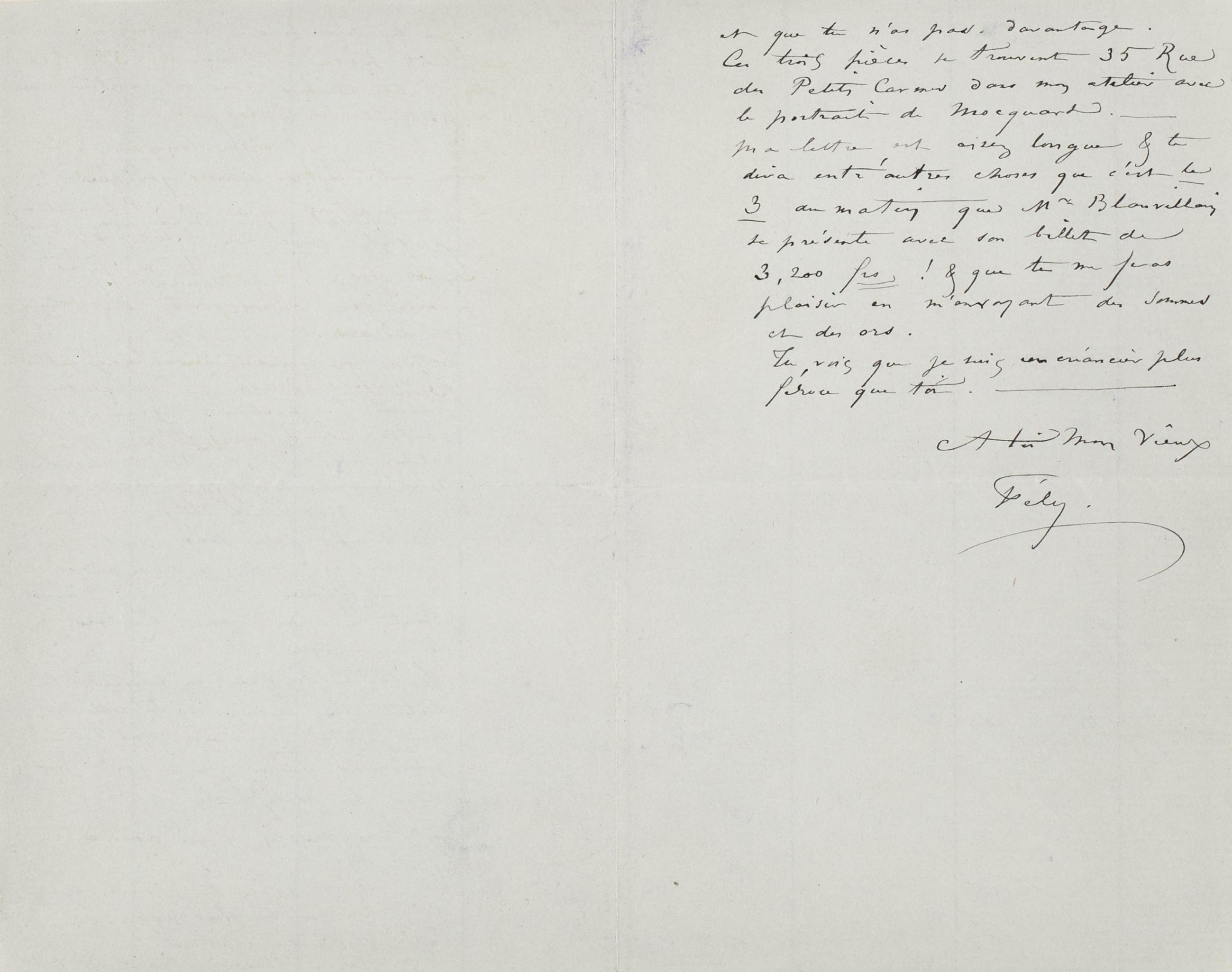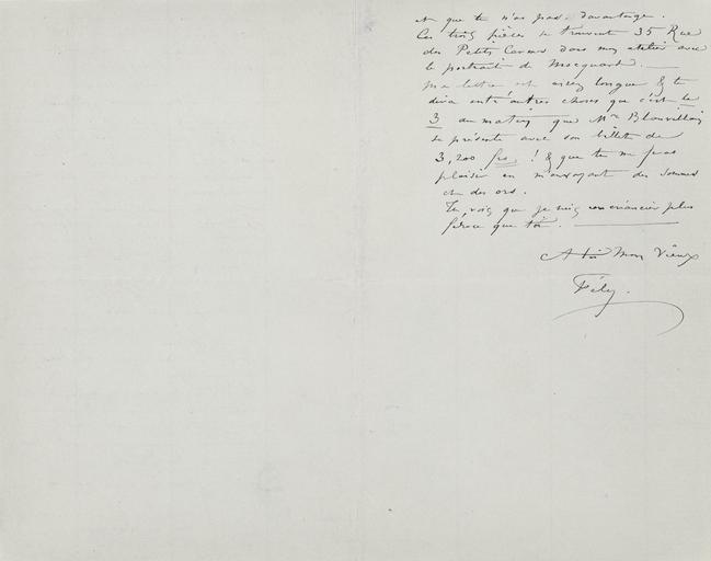 Ma lettre est assez longue & te dira entr’autres choses que c’est le 3 au matin que Mr Blanvillain se présente avec son billet de 3,200 frs ! & que tu me feras plaisir en m’envoyant des sommes et des ors.