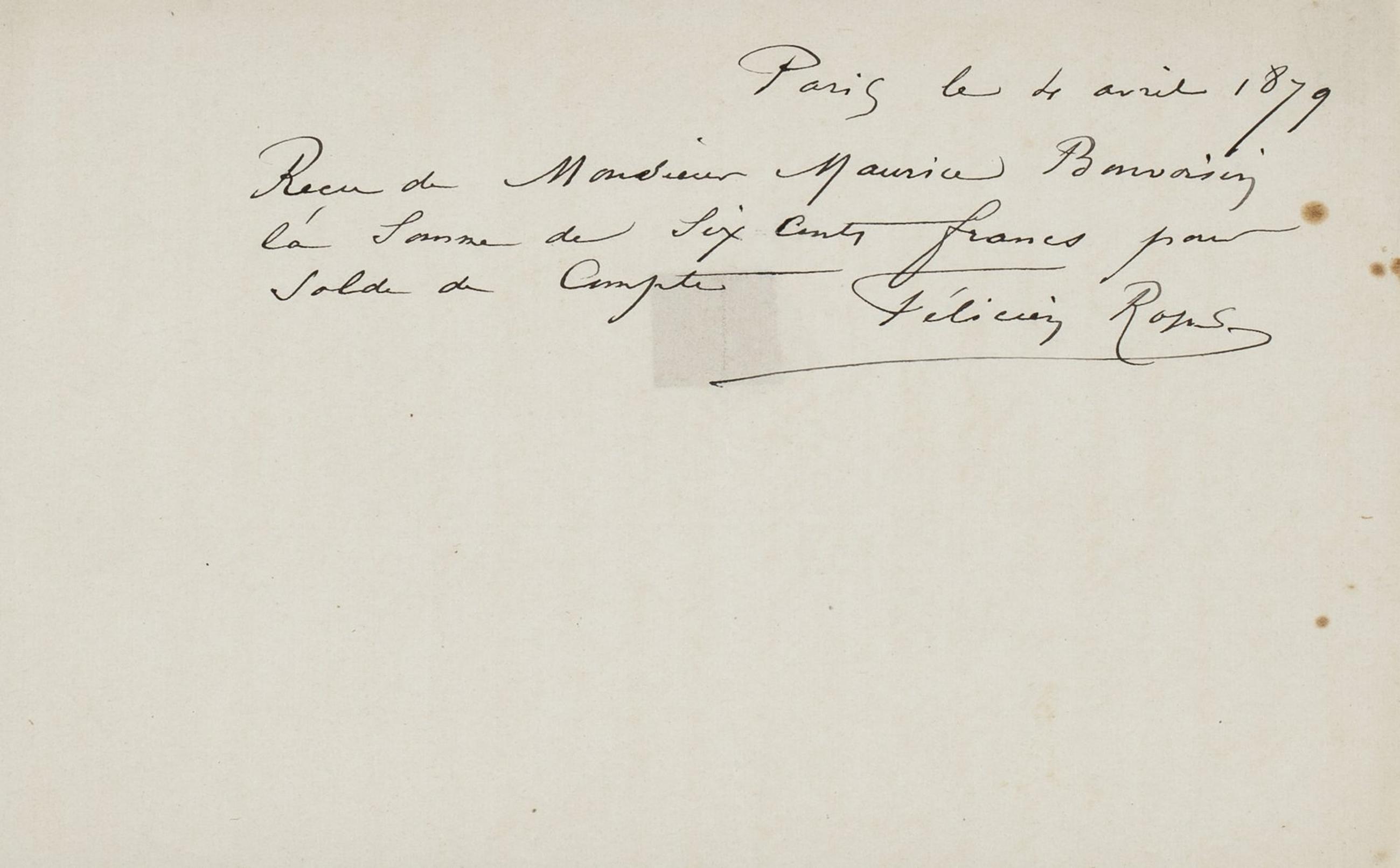 Reçu de Monsieur Maurice Bonvoisin la somme de six cents francs pour solde de compte