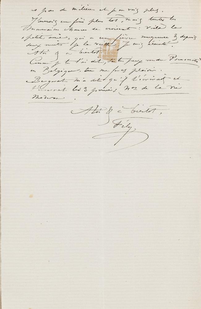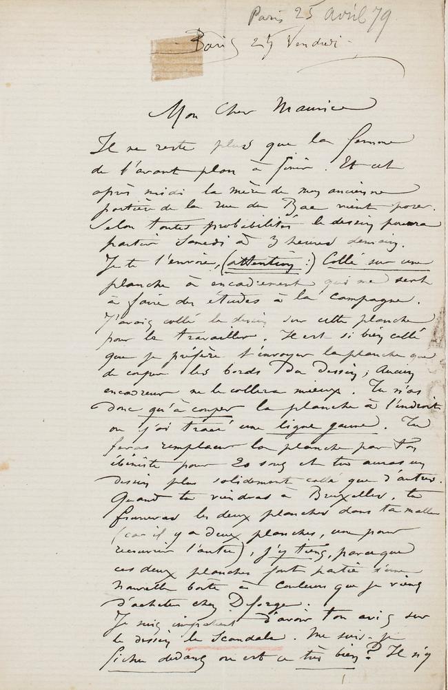Je te l’envoie, (attention :) Collé sur une planche à encadrement qui me sert à faire des études à la campagne. J’avais collé le dessin sur cette planche pour la travailler. Il est si bien collé que je préfère t’envoyer la planche que de couper les bords du dessin ; Aucun encadreur ne le collera mieux. Tu n’as donc qu’à couper la planche à l’endroit où j’ai tracé une ligne jaune. Tu feras remplacer la planche par ton ébéniste pour 20 sous et tu auras un dessin plus solidement collé que d’autres. Quand tu viendras à Bruxelles, tu fourreras les deux planches dans ta malle (car il y a deux planches, une pour recouvrir l’autre), j’y tiens, parce que ces deux planches font partie d’une nouvelle boîte à couleurs que je viens d’acheter chez Deforge.