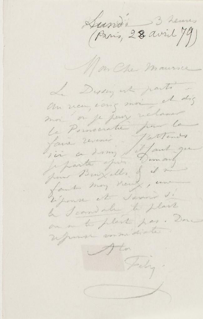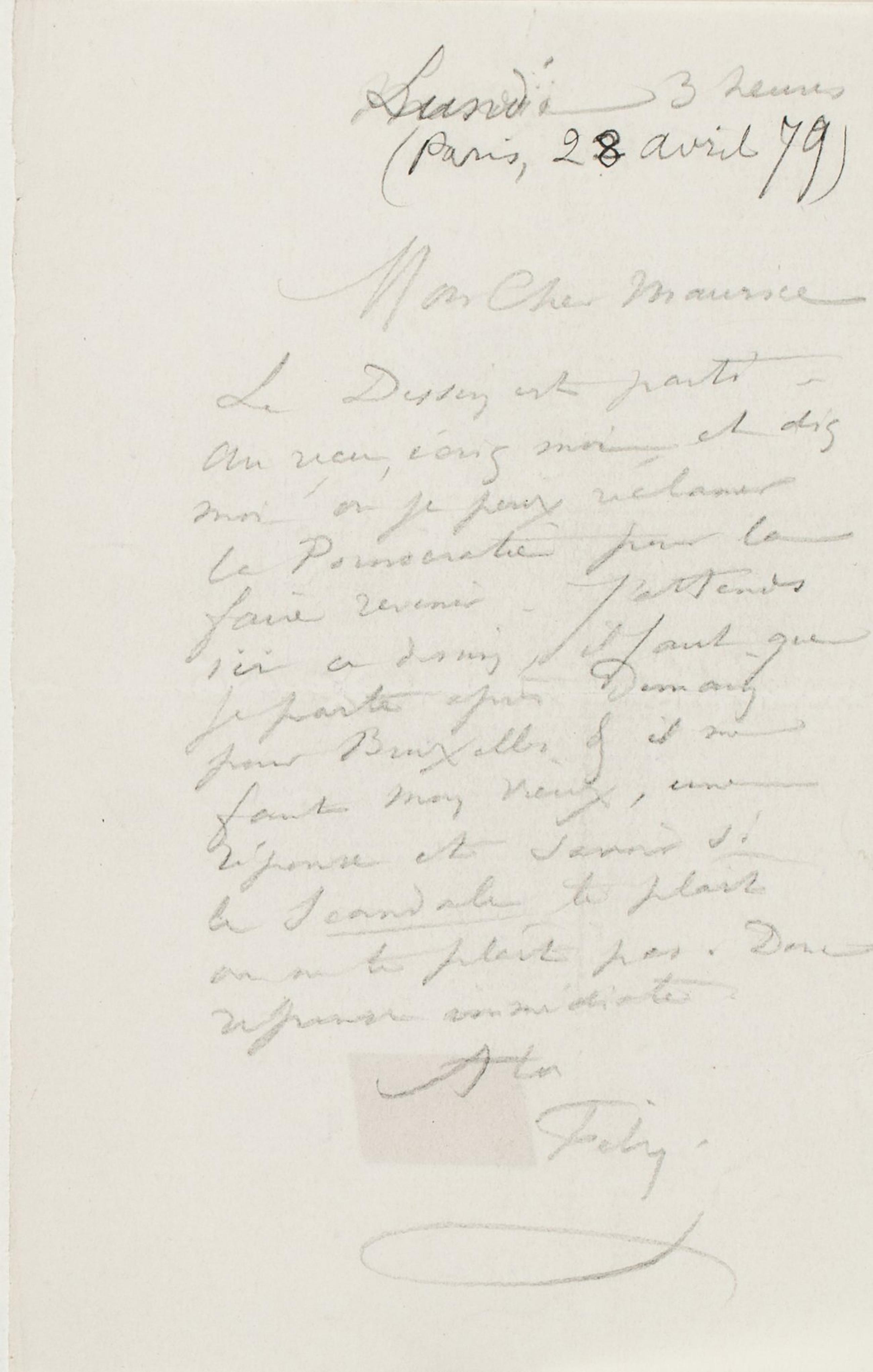 Le Dessin est parti ‒ Au reçu, écris moi et dis moi où je peux réclamer la Pornocratie pour la faire revenir. J’attends ici ce dessin, il faut que je parte après demain pour Bruxelles & il me faut mon vieux, une réponse et savoir si le Scandale te plaît ou ne te plaît pas. Donc réponse immédiate.