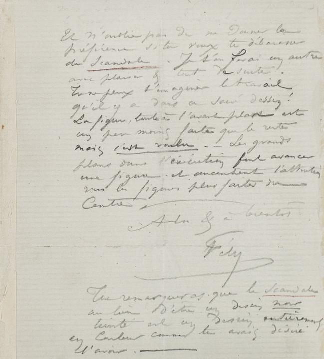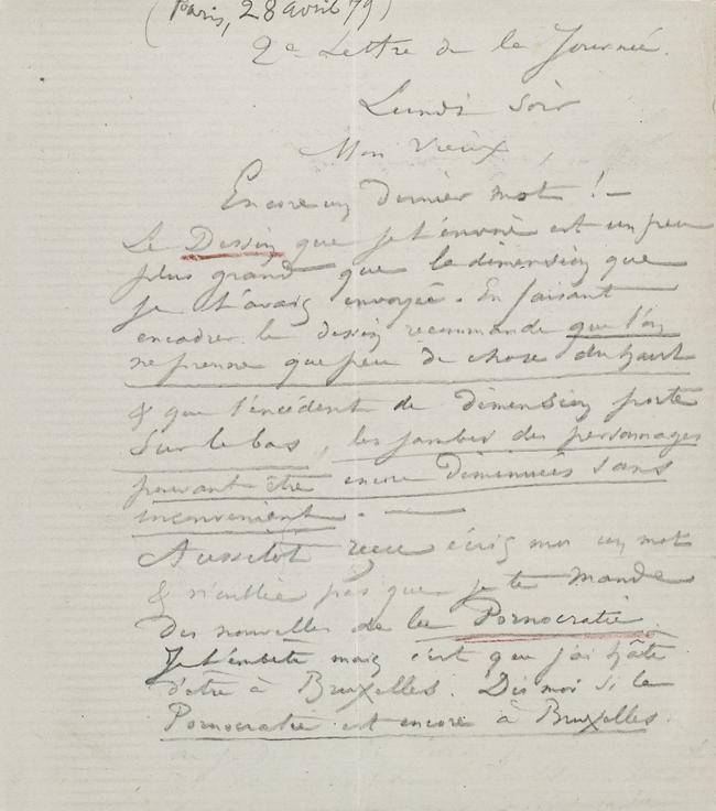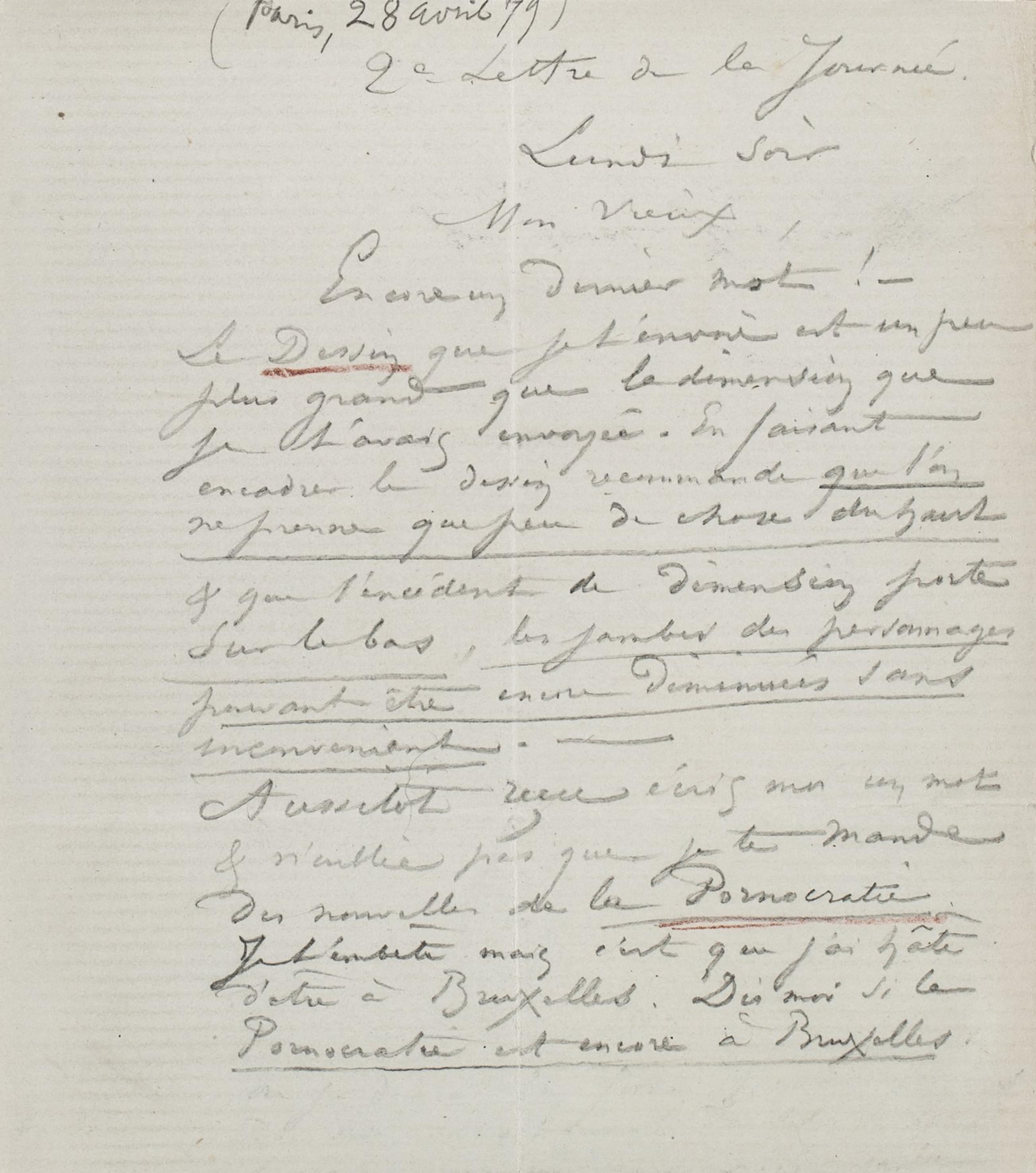 Le Dessin que je t’envoie est un peu plus grand que la dimension que je t’avais envoyée. En faisant encadrer le dessin recomande que l’on ne prenne que peu de chose du haut & que l’excédent de dimension porte sur le bas, les jambes des personnages pourront être encore diminuées sans inconvénient. –