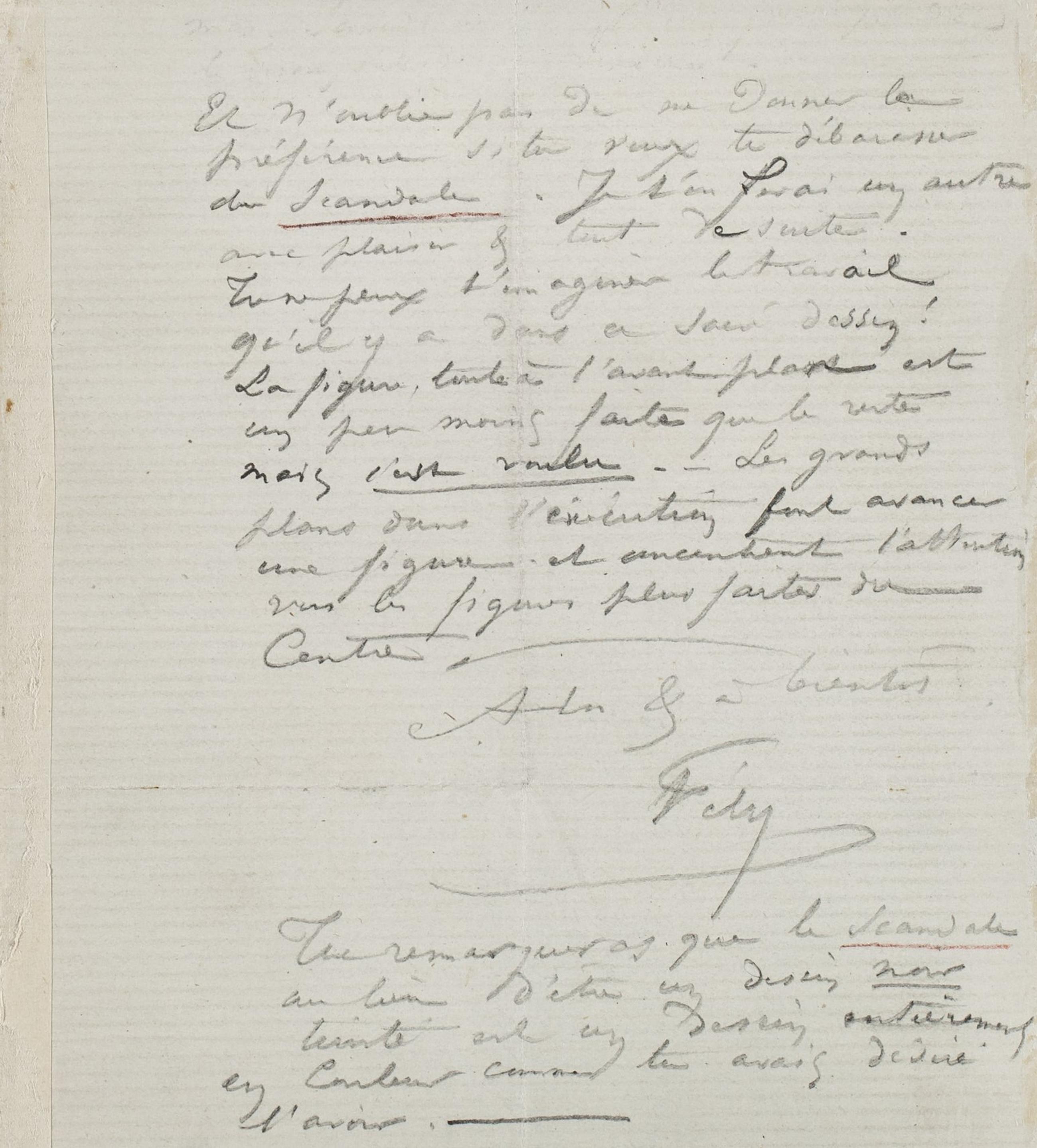 Tu ne peux t’imaginer le travail qu’il y a dans ce sacré dessin ! La figure, toute à l’avant plan est un peu moins forte que le reste mais c’est voulu. – Les grands plans dans l’exécution font avancer une figure et encombrent l’attention vers les figures plus fortes du Centre ‒