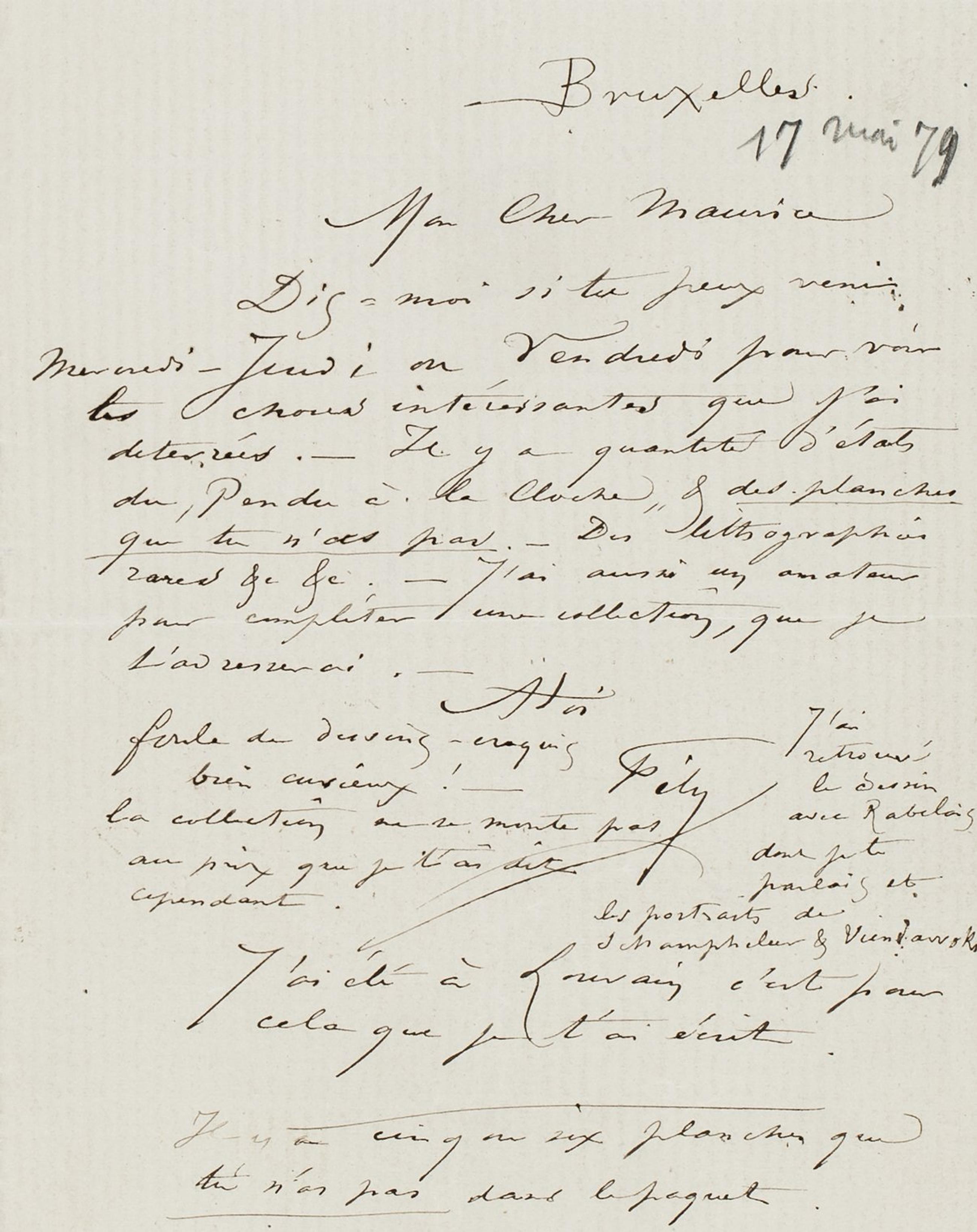 Dis-moi si tu peux venir Mercredi-Jeudi ou Vendredi pour voir les choses intéressantes que j’ai deterrées. – Il y a quantité d’états du, Pendu à la. Cloche » & des planches que tu n’as pas. ‒ Des lithographies rares &c. &c. ‒ J’ai aussi un amateur pour compléter une collection, que je t’adresserai.