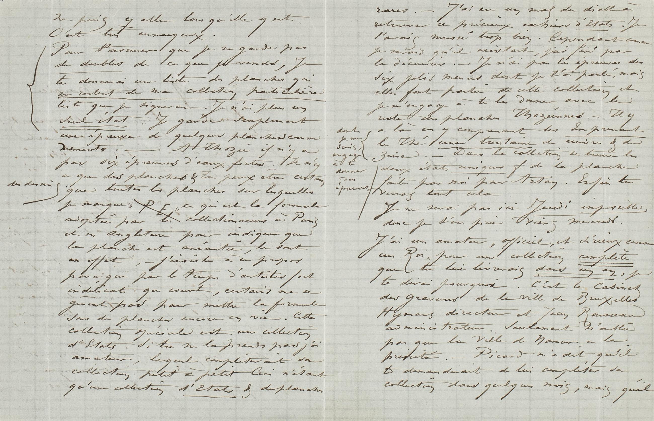 Je veux 1200 frs de ces deux cents pièces. ce n’est pas une collection de planches & de dessins, c’est ma collection particulière d’États que je lave comme je te l’ai dit. Beaucoup sont uniques puisqu’ils ont été tirés par moi. Il y a en outre un nombre énorme de tout de sortes de choses. Cinq ou six croquis des pièces d’En prenant le Thé dont les cuivres sont à Thozée & dont je te donnerai les épreuves avec les autres que je te dois déja, lorsque je pourrai à mon aise aller à Thozée. J’ai manqué mon voyage ma femme est là bàs et je