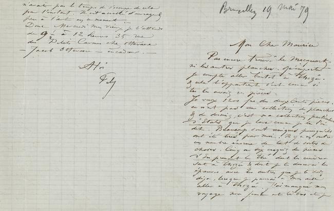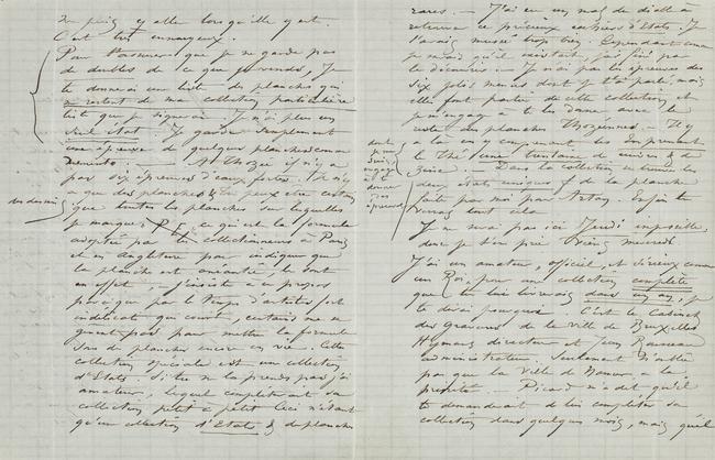 Je ne serai pas ici Jeudi impossible. donc je t’en prie viens Mercredi. J’ai un amateur « officiel, et sérieux comme un Roi » pour une collection complète que tu lui livrerais dans un an, je te dirai pourquoi. C’est le Cabinet des Gravures de la ville de BruxellesHymans directeur et Jean Rousseau administrateur. Seulement n’oublie pas que la ville de Namur a la priorité. ‒ Picard m’a dit qu’il te demanderait de lui compléter sa collection dans quelques mois, mais qu’il
