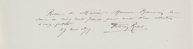 Reçu de Monsieur Maurice Bonvoisin la somme de cinq cents francs pour vente d’une collection d’eaux-fortes.