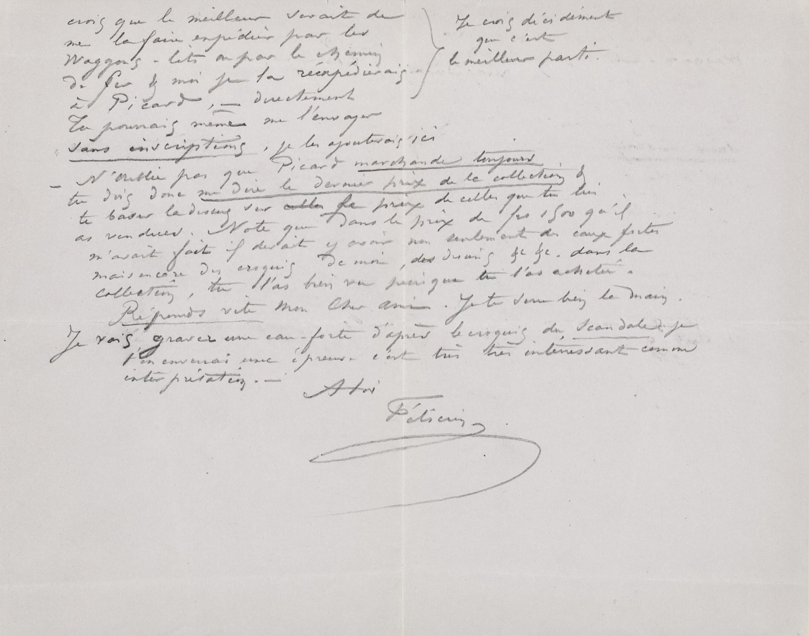 ‒ N’oublie pas que Picardmarchande toujours tu dois donc me dire le dernier prix de la collection & te baser la dessus sur celle le prix de celles que tu lui as vendues. Note que dans le prix de frs 1500 qu’il m’avait fait il devait y avoir non seulement des eaux fortes mais encore des croquis de moi, des dessins &c &c. dans la collection, tu l’as bien vu puisque tu l’as achetée. Réponds viteMon Cher Ami. Je te serre bien la main. Je vais graver une eau-forte d’après le croquis du Scandale je t’en enverrai une épreuve c’est très très intéressant comme interprétation. ‒