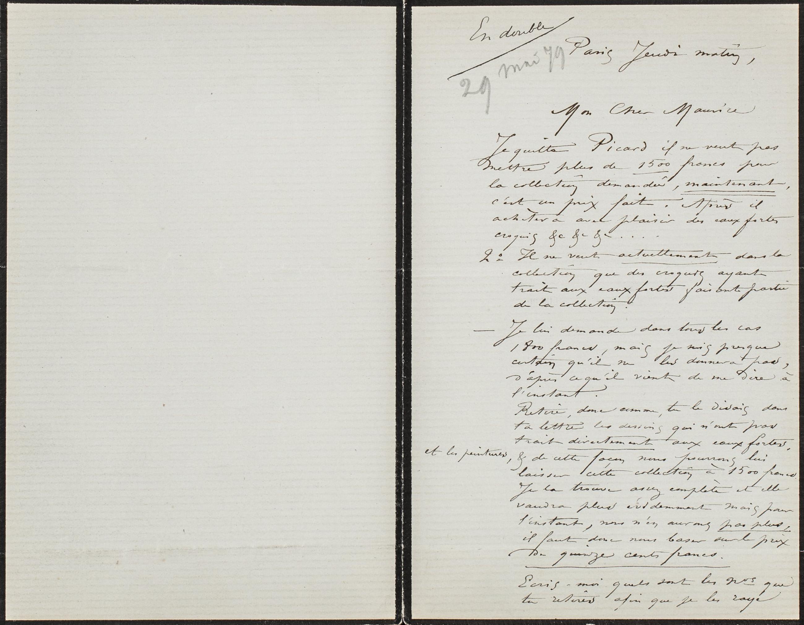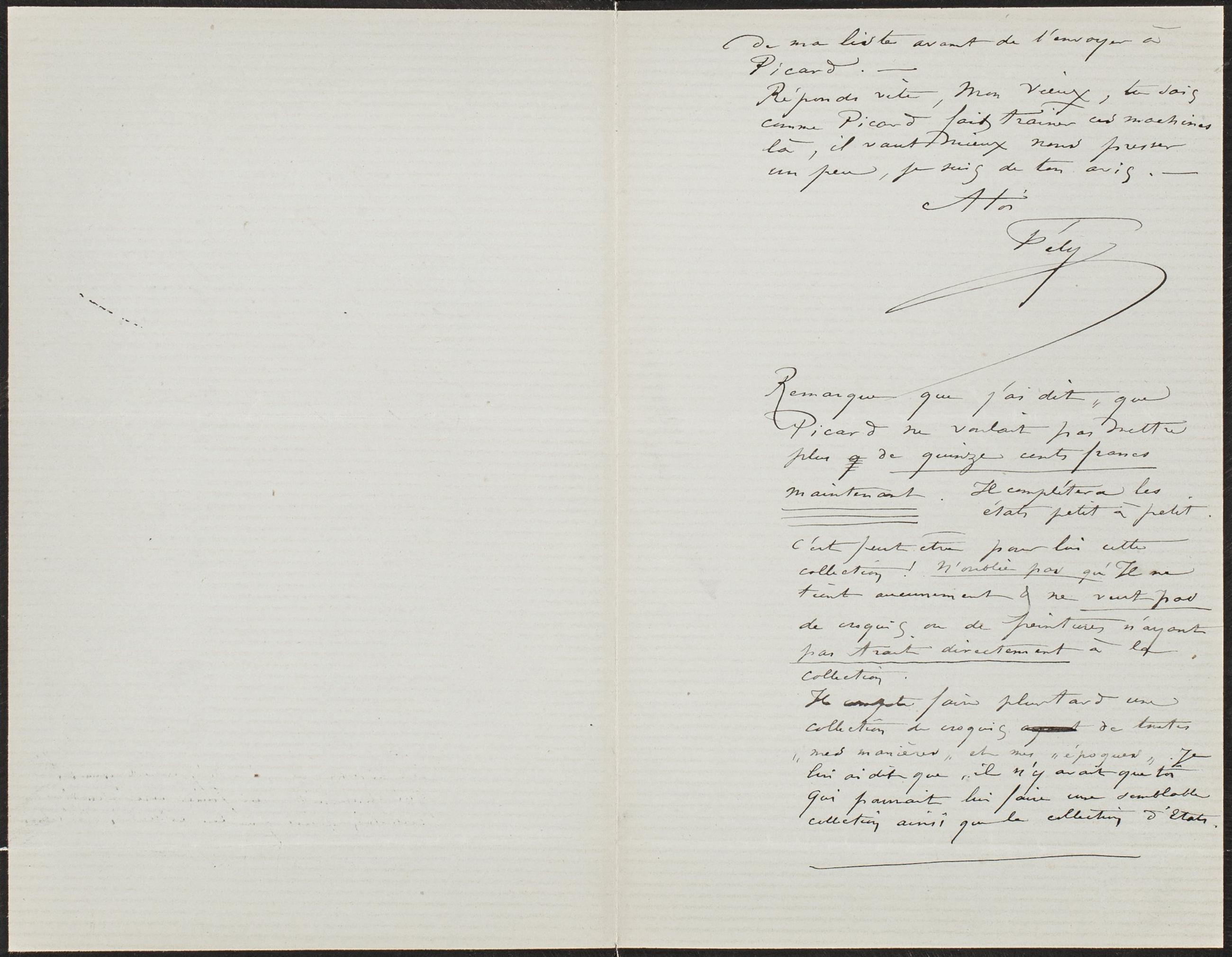 Retire, donc comme, tu le disais dans ta lettre les dessins qui n’ont pas trait directement aux eaux fortes, et les peintures, & de cette façon nous pourrons lui laisser cette collection à 1500 francs. Je la trouve assez complète et elle vaudra plus évidemment mais pour l’instant, nous n’en aurons pas plus, il faut donc nous baser sur le prix de quinze cents francs.