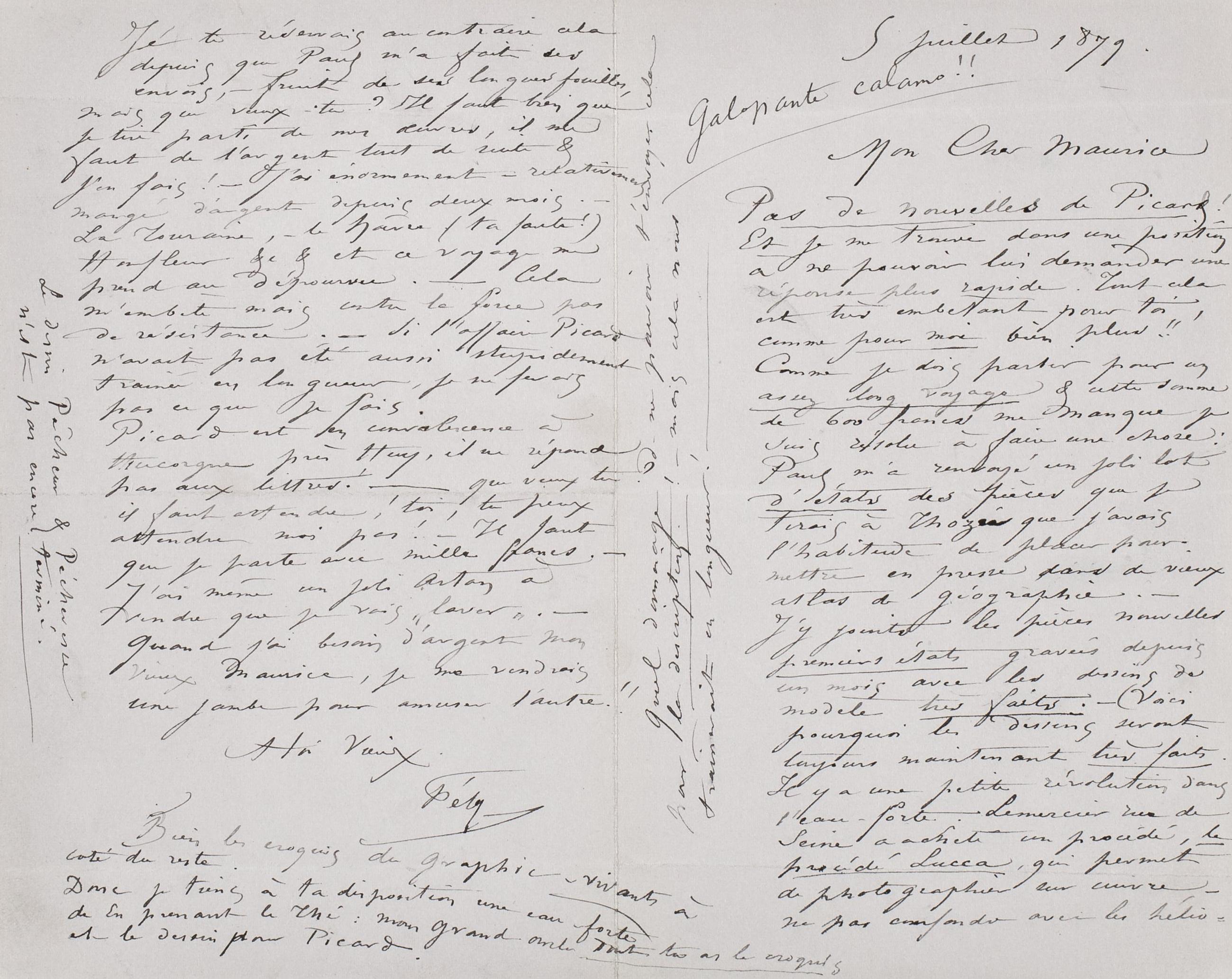 Je te réservais au contraire cela depuis que Paul m’a fait des envois, ‒ fruit de ses longues feuilles, mais que veux-tu ? Il faut bien que je tire parti de mes œuvres, il me faut de l’argent tout de suite & j’en fais ! ‒ J’ai énormément – relativement ‒ mangé d’argent depuis deux mois. ‒ La Touraine, ‒ Le Hâvre (ta faute !) Honfleur &c & et ce voyage me prend au dépourvu. ‒ Cela m’embête mais contre la force pas de résistance. ‒ Si l’affaire Picard n’avait pas été aussi stupidement trainée en longueur, je ne ferai pas ce que je fais.
