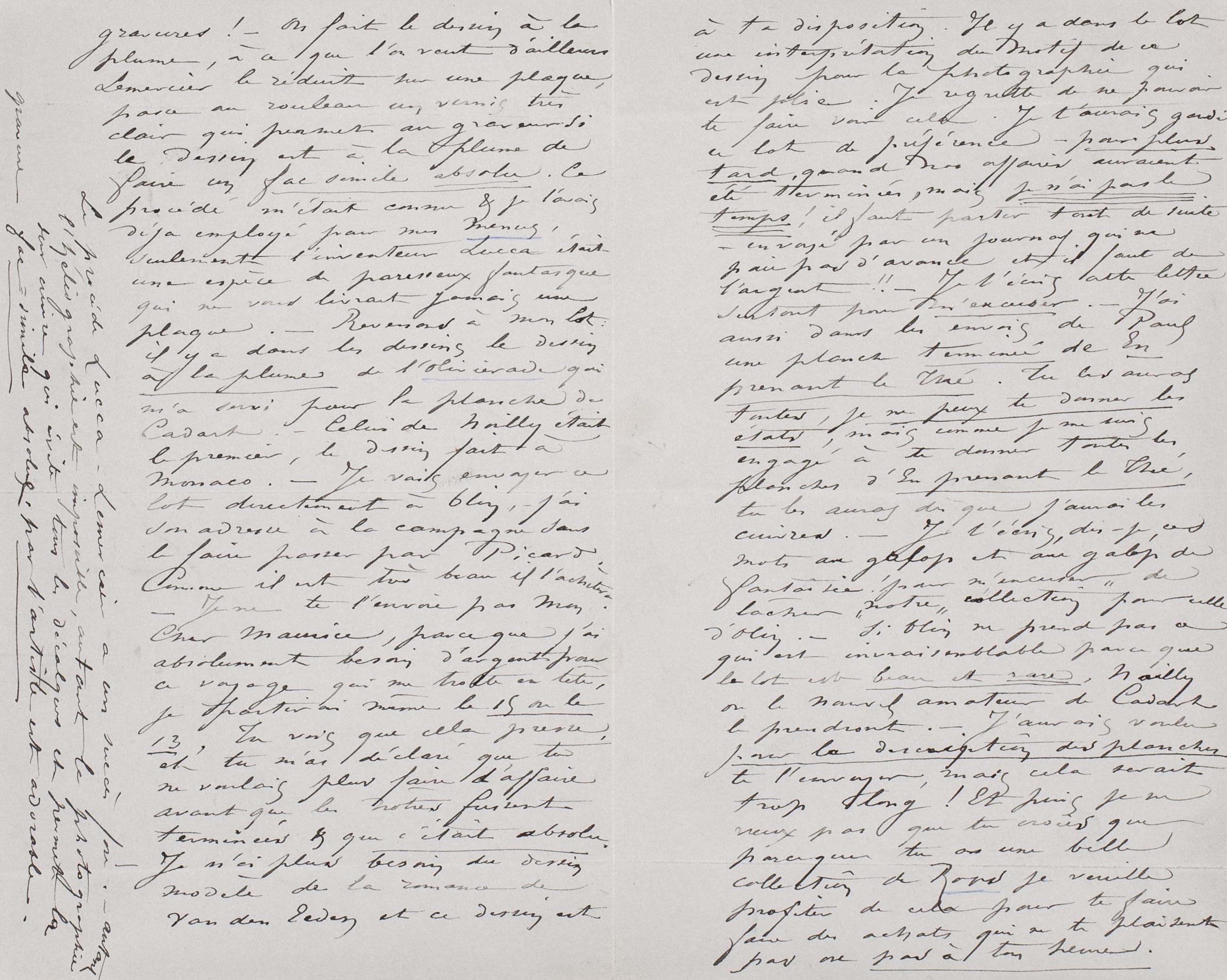 gravures ! ‒ On fait le dessin à la plume, à ce qu’on veut d’ailleurs Lemercier le réduit sur une plaque, passe au rouleau un vernis très clair qui permet au graveur si le dessin est à la plume d’en faire un fac-simile absolu. Ce procédé m’était connu & je l’avais déja employé pour mes menus, seulement l’inventeur Lucca était une espèce de paresseux fantasque qui ne vous livrait jamais une plaque.