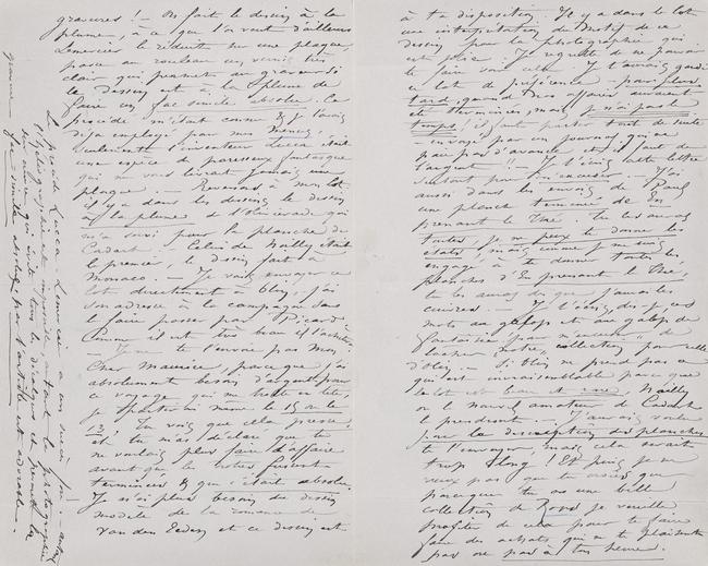 à ta disposition. Il y a dans le lot une interprétation du motif de ce dessin pour la photographie qui est jolie. Je regrette de ne pouvoir te faire voir cela. Je t’aurais gardé ce lot de préférence ‒ pour plus tard, quand nos affaires auraient été terminées, mais je n’ai pas le temps ! il faut partir tout de suite – envoyé par un journal qui ne paie pas d’avance et il faut de l’argent !! ‒ Je t’écris cette lettre surtout pour m’excuser. ‒ J’ai aussi dans les envois de Paul une planche terminée de En prenant le Thé. Tu les auras toutes, je ne peux te donner les états, mais comme je me suis engagé à te donner toutes les planches d’En prenant le Thé, tu les auras dès que j’aurai les cuivres. ‒ Je t’écris, dis-je, ces mots au galop et au galop de fantaisie ! pour m’ « excuser » de lâcher « notre » collection pour celle d’Olin. ‒ Si Olin ne prend pas ce qui est invraisemblable parce que le lot est beau et rare, Noilly ou le nouvel amateur de Cadart le prendront. ‒ J’aurais voulu pour la description des planches te l’envoyer, mais cela serait trop long ! Et puis je ne veux pas que tu croies que parce que tu as une belle collection de Rops je veuille profiter de cela pour te faire faire des achats qui ne te plaisent pas ou pas à ton heure.