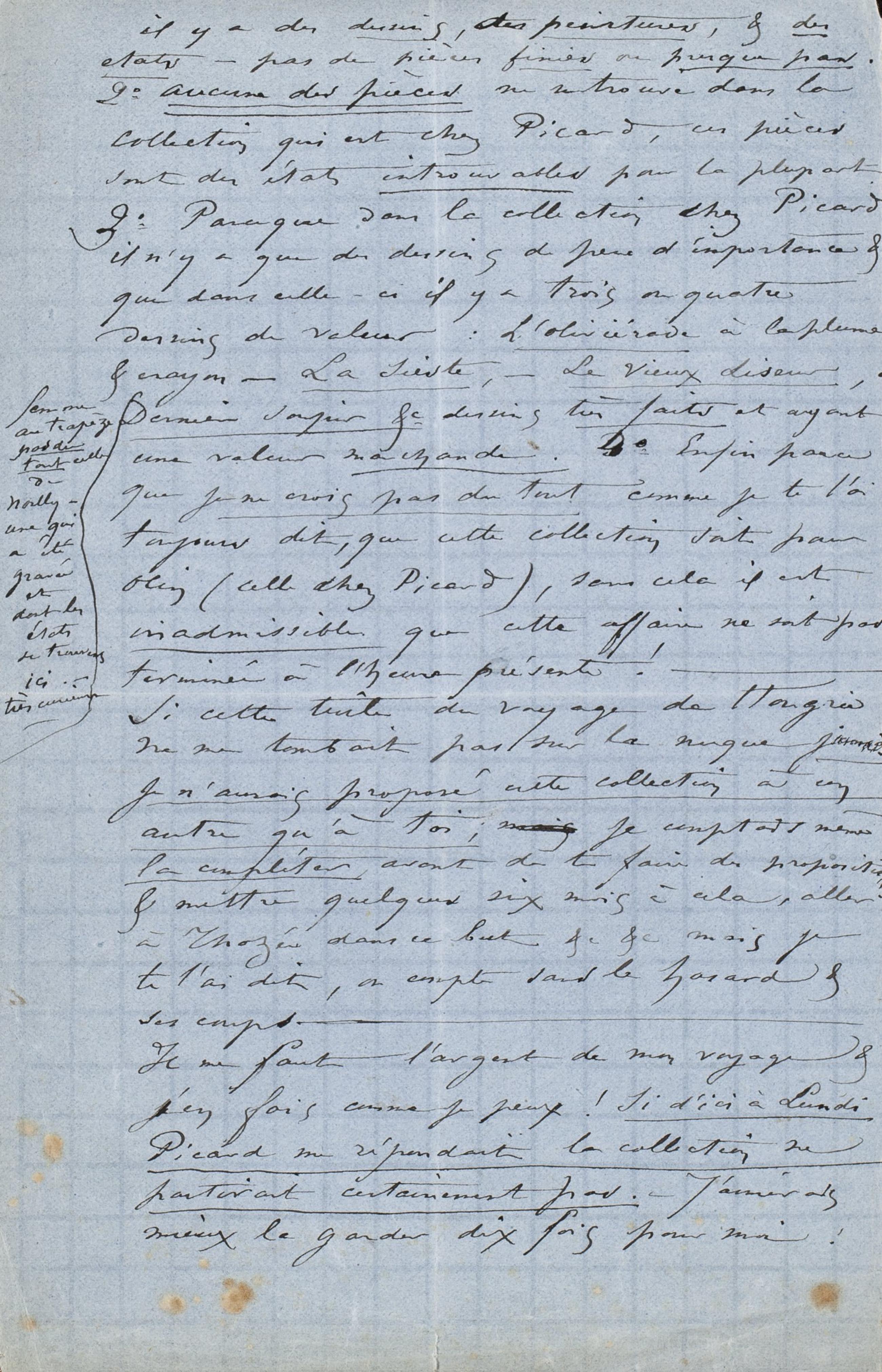 il y a des dessins, des peintures, & des états – pas de pièces finies ou presque pas. 2° Aucune des pièces ne se trouve dans la Collection qui est chez Picard, ces pièces sont des pièces introuvables pour la plupart. 3° Parce que dans la collection chez Picard il n’y a que des dessins de peu d’importance & que dans celle-ci il y a trois ou quatre dessins de valeur : L’oliviérade à la plume & crayon. – La Sieste, – Le Vieux Liseur, femme au trapèze pas du tout celle de Noilly – une qui a été gravée et dont les états se trouvent ici. – très curieux. Dernier soupir &c dessins très faits et ayant une valeur marchande. 4° Enfin parce que je ne crois pas du tout comme je te l’ai toujours dit, que cette collection soit pour Olin (celle chez Picard), sans cela il est inadmissible que cette affaire ne soit pas terminée à l’heure présente ! –