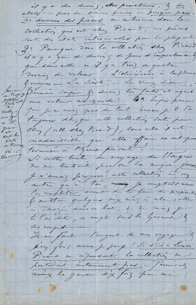 Toutes tes reflexions « je me les suis faites !! » – réflexions justes ! Mais que veux-tu ? J’ai compté sans l’imprévu ! & l’imprévu : c’est la maladie de Picard & c’est le voyage de Hongrie ! Il faut que je parte, je n’ai que cela à vendre pour le moment. Je ne veux pas gâter « la place de Paris » comme on dit au Bon Marché en laissant ma peinture à des prix trop doux. Je n’ai que cela, cette collection, & j’en tire naturellement le prix de mon voyage. Picard ne répond pas ! Voilà trois fois que je lui écris, il m’a fait répondre par sa sœur qu’il était malade et que son état l’empêchait tout à fait de s’occuper de quelque chose. – Je lui ai proposé deux jolis petits tableaux un d’Artan & un de moi pour 500 frs – il n’a pas plus répondu ! – je ne sais pas si on lui remis les lettres. – Maintenant quant à nuire à l’achat de la Collection qui est chez Picard par cette proposition nouvelle faite à Olin, – cela n’aura pas lieu, et cela ne peut avoir lieu 1° parce que ces collections ne se ressemblent pas. Dans celle ci