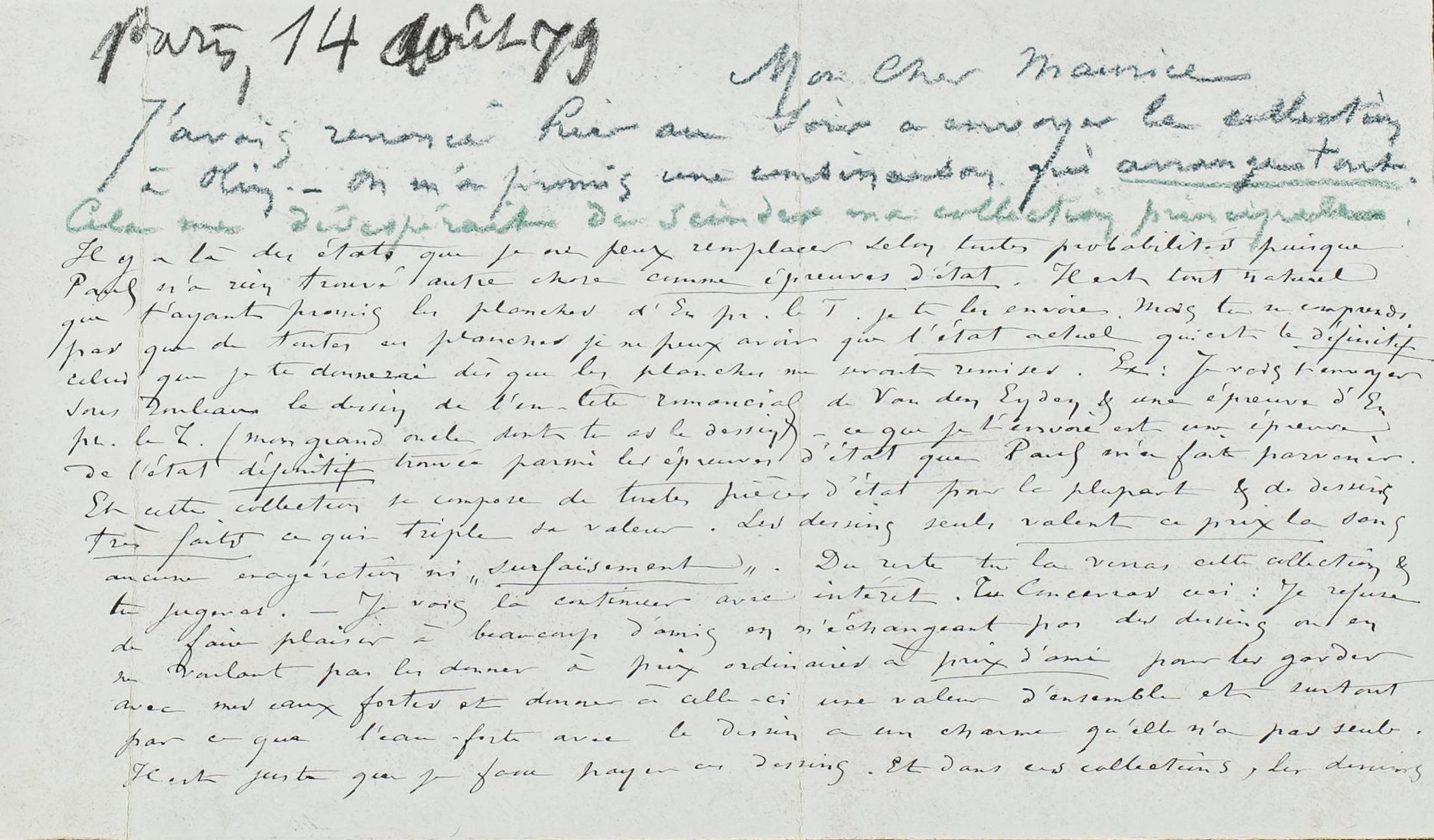 J’avais renoncé hier au soir a envoyer la collection à Olin. ‒ On m’a promis une combinaison qui arrange tout. Cela me désespérait de scinder ma collection principale. Il y a là des états que je ne peux remplacer selon toute probabilité puisque Paul n’a rien trouvé autre chose comme épreuves d’état. Il est tout naturel que t’ayant promis les planches d’En pr. le T. je te les envoie. Mais tu ne comprends pas que de toutes ces planches je ne peux avoir que l’état actuel qui est le définitif celui que je te donnerai dès que les planches me seront remises. Ex : Je vais t’envoyer sous rouleau le dessin de l’en-tête romancial de Van den Eyden & une épreuve d’En pr. le T. (mon grand oncle dont tu as le dessin) – ce que je t’envoie est une épreuve de l’état définitif trouvée parmi les épreuves d’état que Paul m’a fait parvenir. Et cette collection se compose de toutes pièces d’état pour la plupart & de dessins très faits ce qui triple sa valeur. Les dessins seuls valent ce prix là sans aucune exagération ni « surfaisement ». Du reste tu la verras cette collection & tu jugeras. ‒ Je vais la continuer avec intérêt. Tu concevras ceci : Je refuse de faire plaisir à beaucoup d’amis en n’échangeant pas des dessins ou en ne voulant pas les donner à prix ordinaire à prix d’ami pour les garder avec mes eaux fortes et donner à celles-ci une valeur d’ensemble et surtout par ce que l’eau-forte avec le dessin a un charme qu’elle n’a pas seule. Il est juste que je fasse payer ces dessins. Et dans ces collections, les dessins