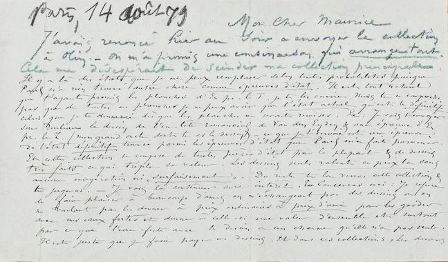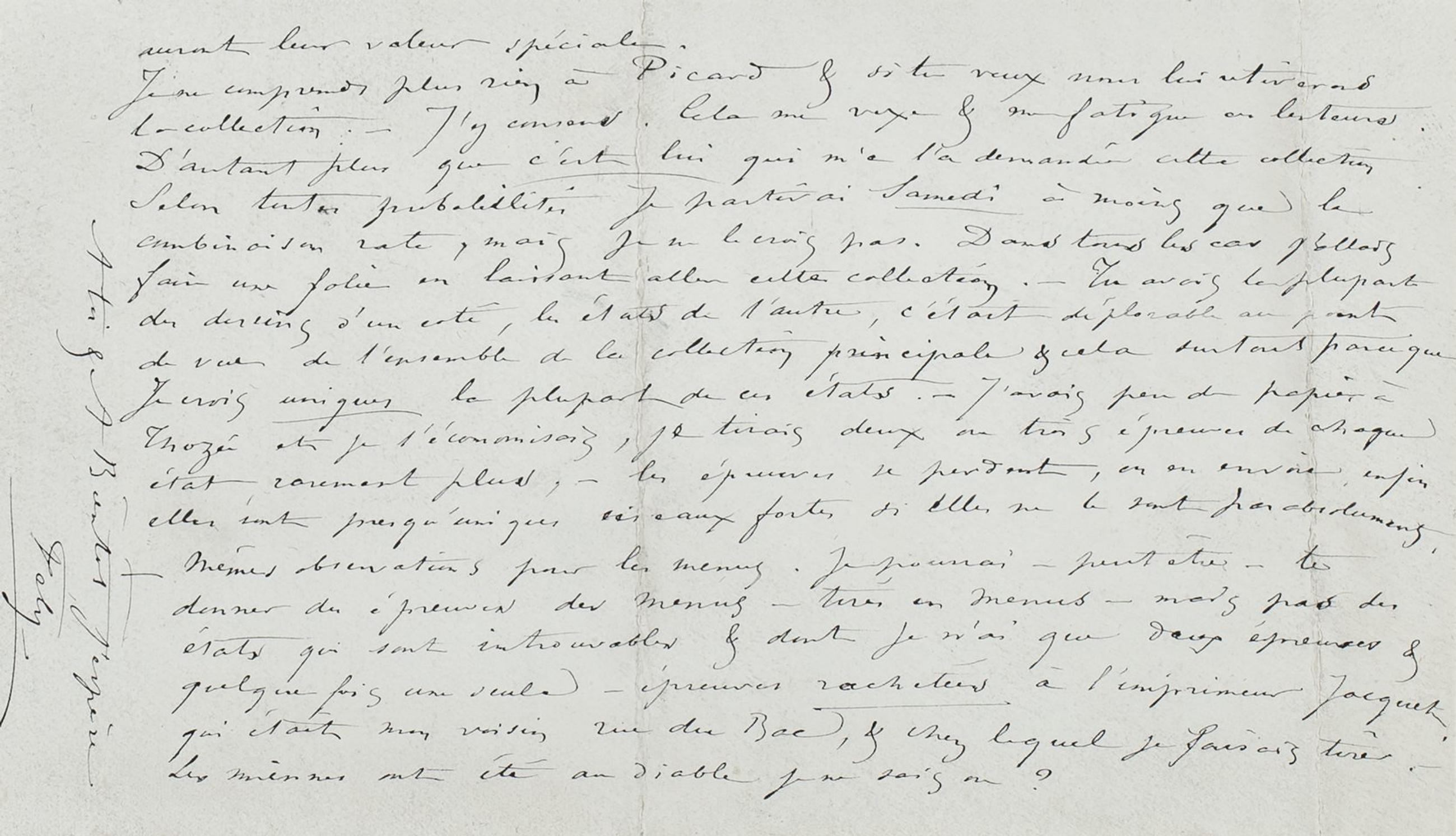 Je ne comprends plus rien à Picard & si tu veux nous lui retirerons la collection. ‒ J’y consens. Cela me vexe & me fatigue ces lenteurs. D’autant plus que c’est lui qui m’a demandé cette collection. Selon toutes probabilités je partirai Samedi à moins que la combinaison rate, mais je ne le crois pas. Dans tous les cas j’allais faire une folie en laissant aller cette collection. ‒ Tu avais la plupart des dessins d’un coté, les états de l’autre, c’était déplorable au point de vue de l’ensemble de la collection principale & cela surtout parce que Je crois uniques la plupart de ces états. ‒ J’avais peu de papier à Thozée et je l’économisais, je tirais deux ou trois épreuves de chaque état, rarement plus, ‒ les épreuves se perdent, on en envoie, enfin elles sont presqu’uniques ces eaux fortes si elles ne le sont pas absolument.