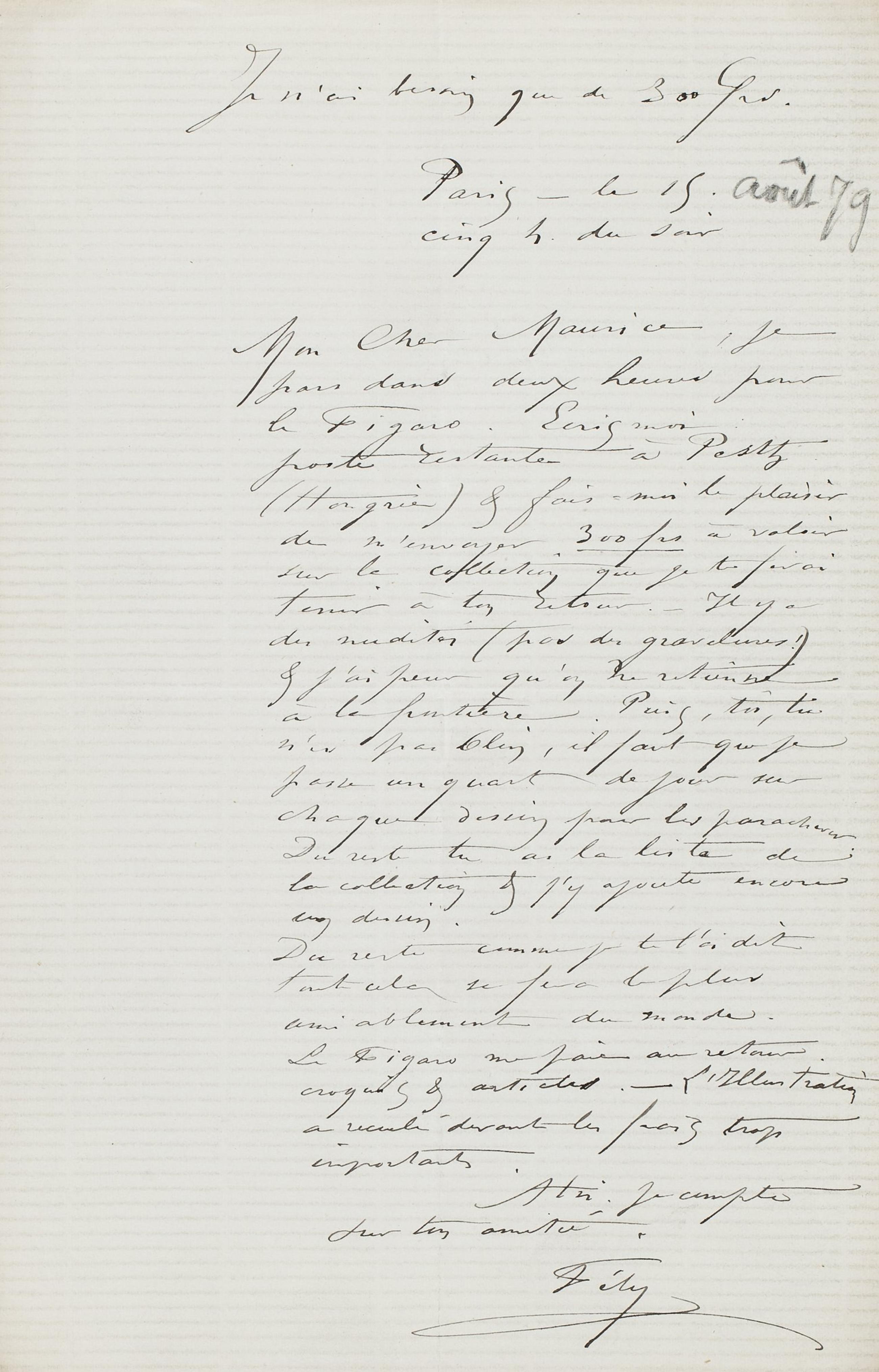 je pars dans deux heures pour le Figaro. Écris moi : poste restante à Pesth (Hongrie) & fais-moi le plaisir de m’envoyer 300 frs à valoir sur la collection que je te ferai tenir à ton retour. ‒ Il y a des nudités (pas de gravelures !) & j’ai peur qu’on me retienne à la frontière. Puis, toi, tu n’es pas Olin, il faut que je passe un quart de jour sur chaque dessin pour les parachever. Du reste tu as la liste de la collection & j’y ajoute encore un dessin.