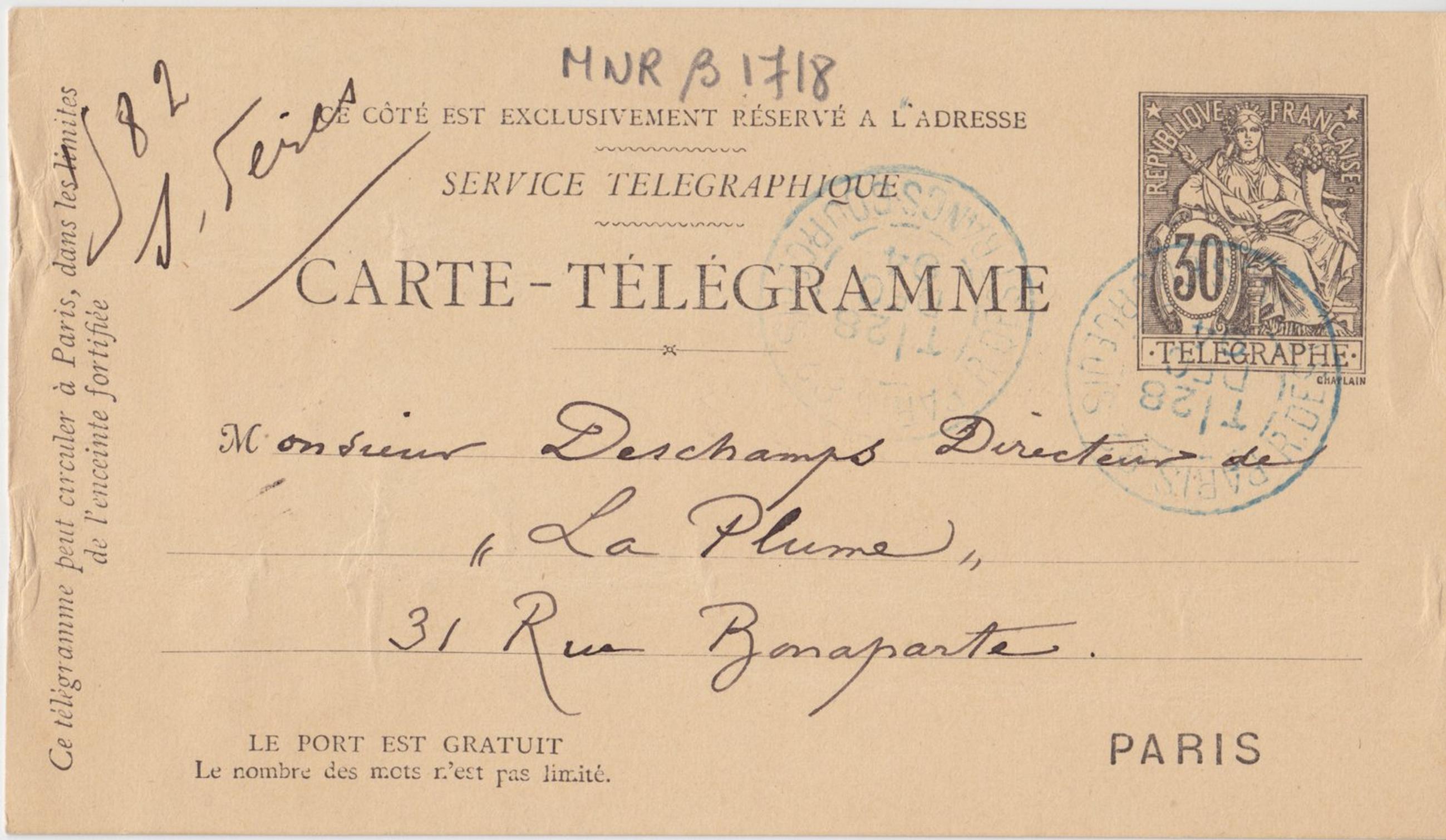 Monsieur Deschamps Directeur de « La Plume » 31 Rue Bonaparte Page 1 Verso : 2