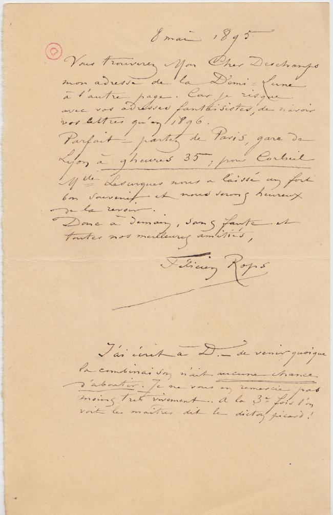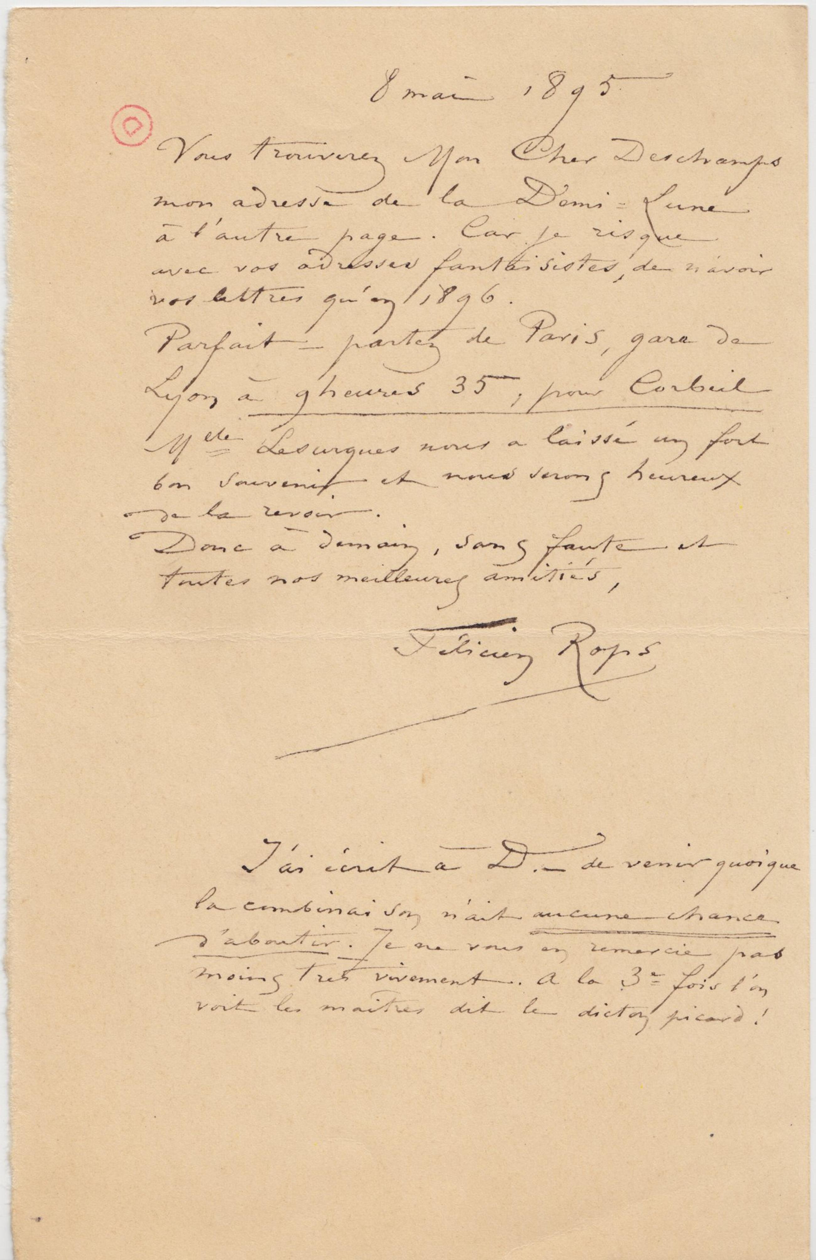 Vous trouverez Mon Cher Deschamps mon adresse de la Demi-Lune à l’autre page. Car je risque avec vos adresses fantaisistes, de n’avoir vos lettres qu’en 1896.
